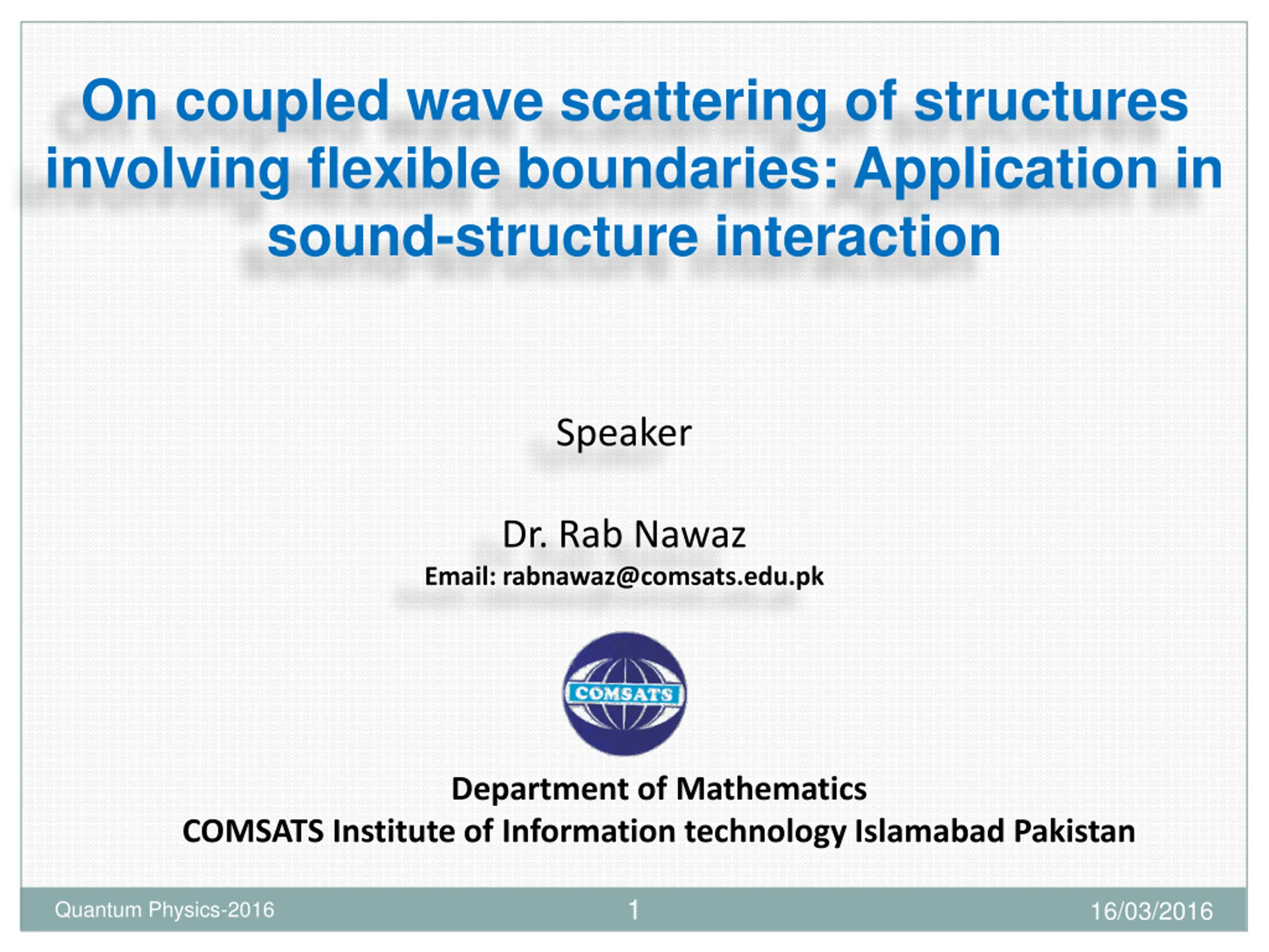 On coupled wave scattering of structures involving flexible boundaries: Application in sound-structure interaction Speaker Dr. Rab Nawaz Email: rabnawaz@comsats.edu.pk Department of Mathematics COMSATS Institute of Information technology Islamabad Pakistan 1 16/03/2016 Quantum Physics-2016