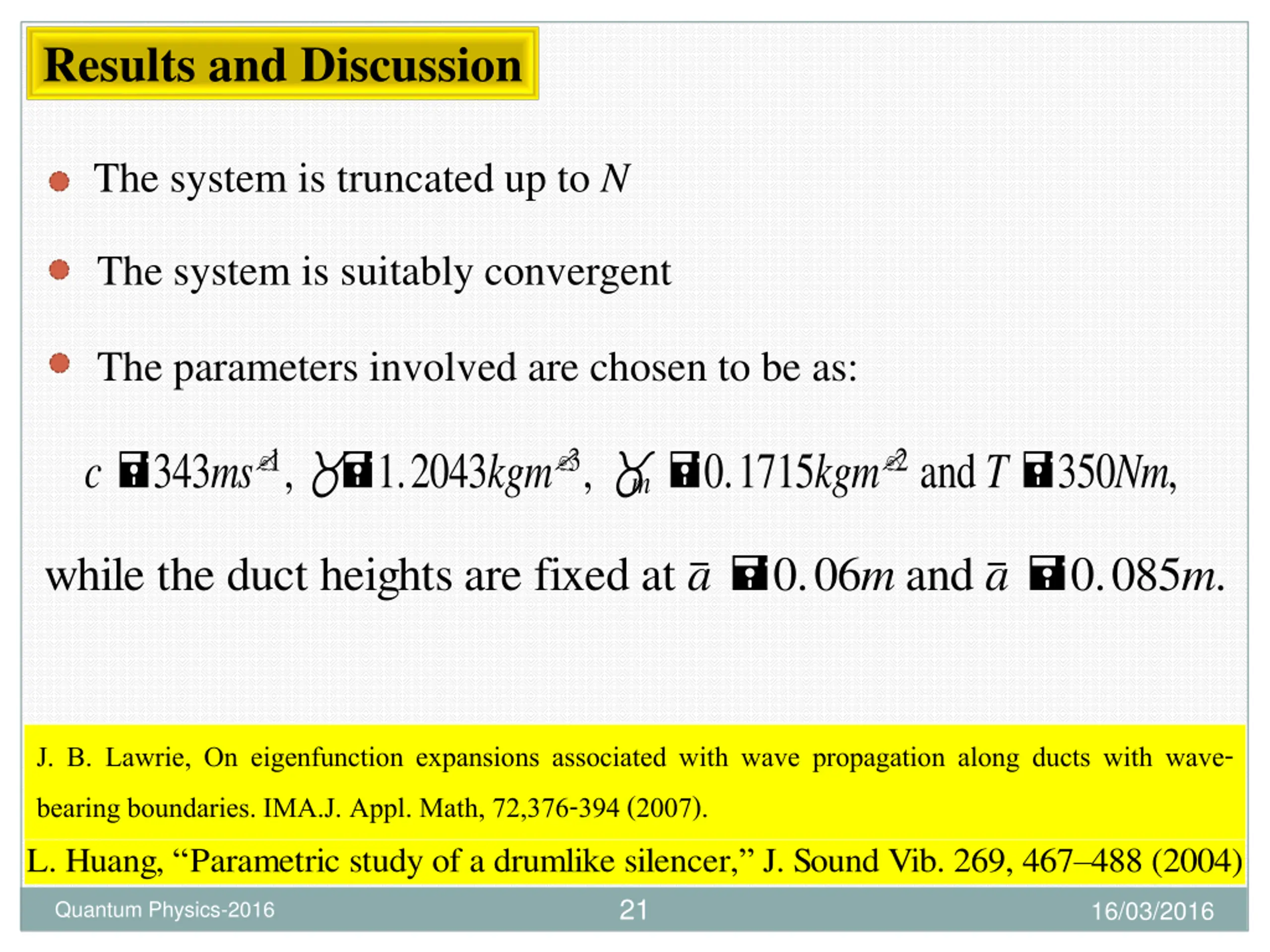 Results and Discussion The system is truncated up to N The system is suitably convergent The parameters involved are chosen to be as: c 343ms 1, 1.2043kgm 3, m 0.1715kgm 2and T 350Nm, while the duct heights are fixed at a 0.06m and a 0.085m. J. B. Lawrie, On eigenfunction expansions associated with wave propagation along ducts with wave- bearing boundaries. IMA.J. Appl. Math, 72,376-394 (2007). L. Huang, Parametric study of a drumlike silencer, J. Sound Vib. 269, 467 488 (2004) 21 16/03/2016 Quantum Physics-2016