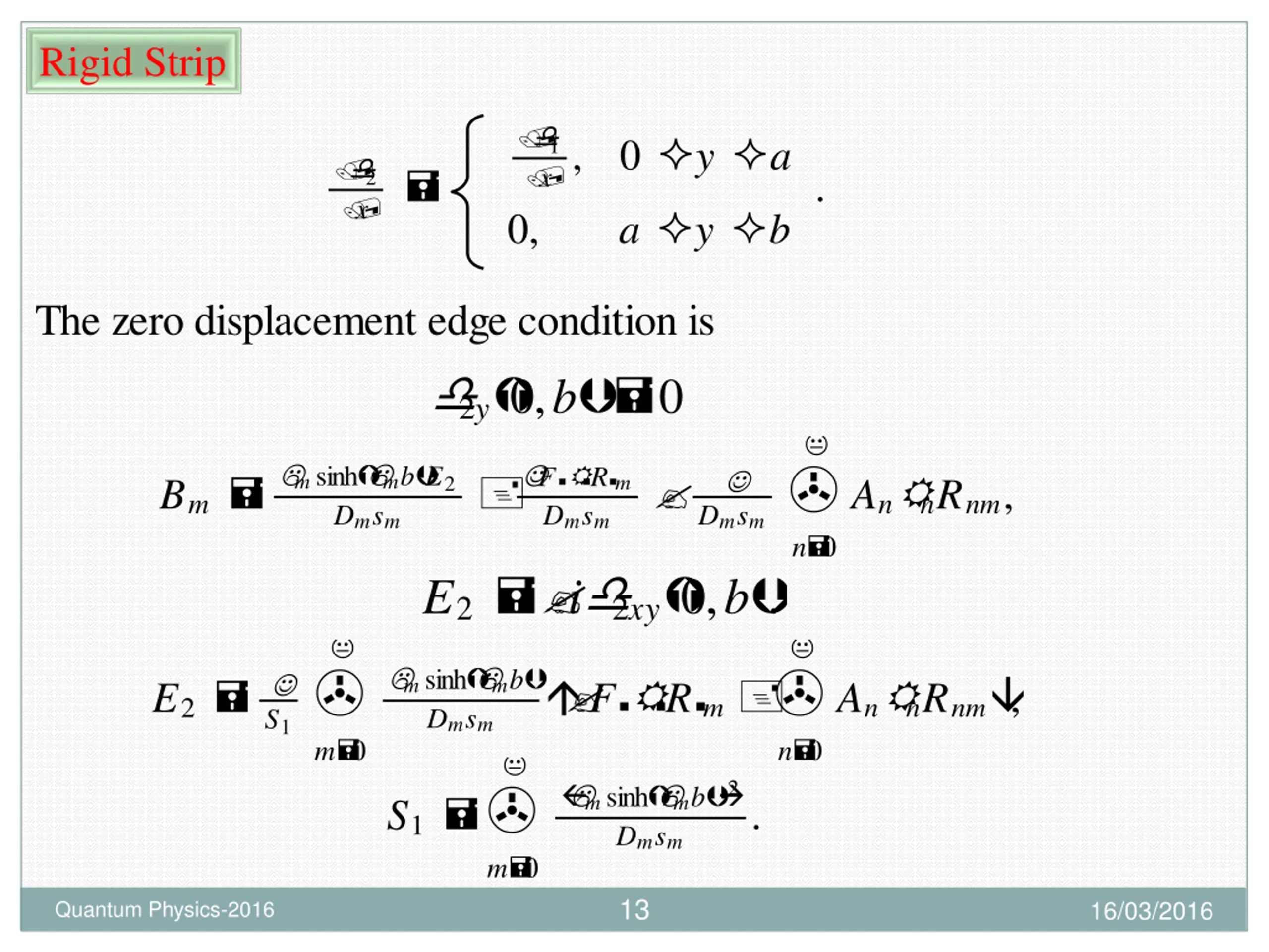 Rigid Strip 1 0, x, 0 y a a y b 2 x . The zero displacement edge condition is 2y 0,b 0 Dmsm msinh mb E2 Dmsm F R m Dmsm An nRnm, Bm n 0 E2 i 2xy 0,b . S1 m 0 F R m msinh mb Dmsm E2 An nRnm , n 0 2 S1 msinh mb Dmsm . m 0 13 16/03/2016 Quantum Physics-2016