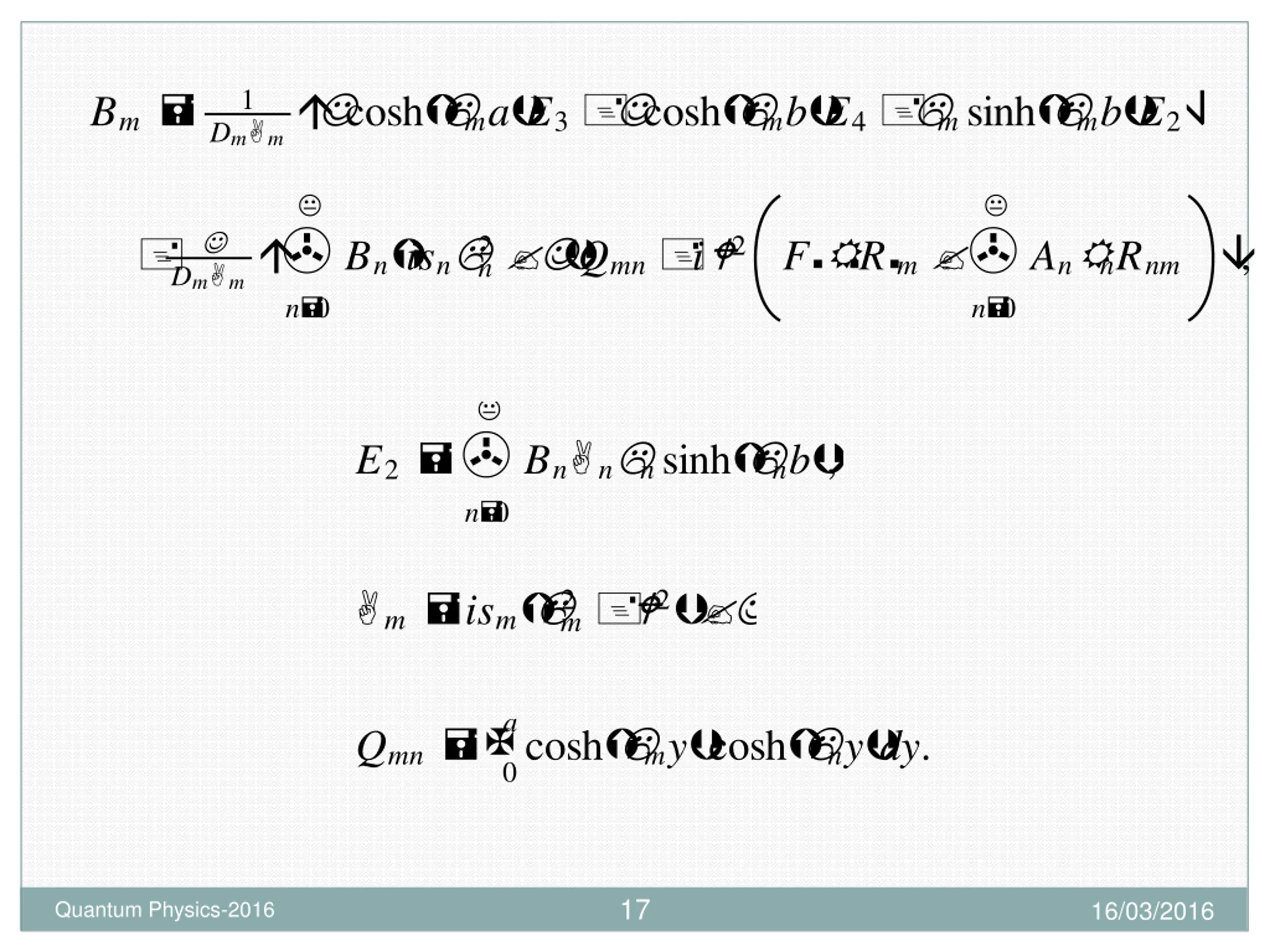 1 Dm m cosh ma E3 cosh mb E4 msinh mb E2 Bm Dm m F R m 2 Qmn i 2 , Bn isn n An nRnm n 0 n 0 E2 Bn n nsinh nb , n 0 2 2 m ism m acosh my cosh ny dy. Qmn 0 17 16/03/2016 Quantum Physics-2016