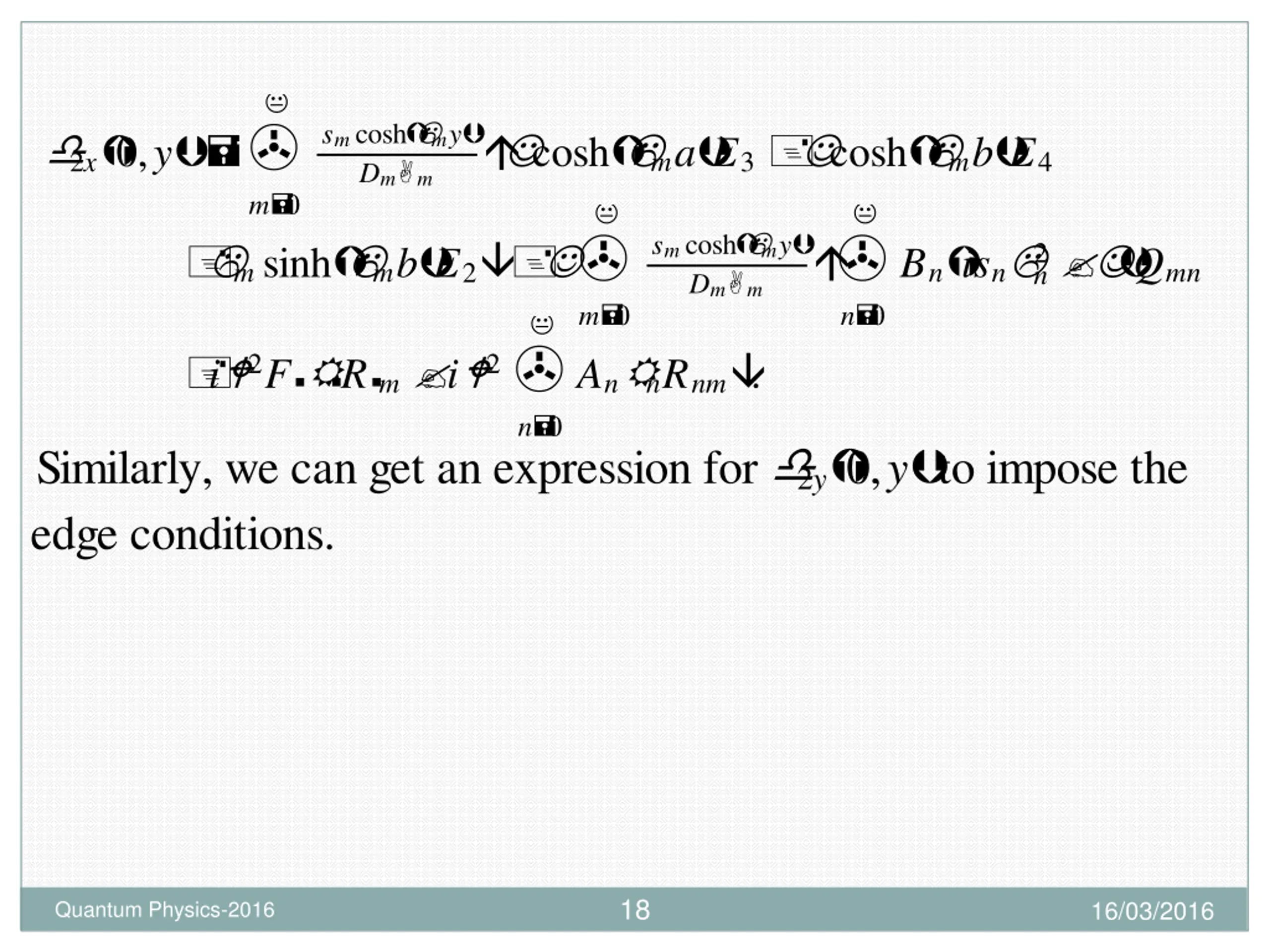 2x 0,y smcosh my Dm m cosh ma E3 cosh mb E4 m 0 msinh mb E2 n 0 smcosh my Dm m 2 Qmn Bn isn n m 0 An nRnm . i 2F R m i 2 n 0 Similarly, we can get an expression for 2y 0,y to impose the edge conditions. 18 16/03/2016 Quantum Physics-2016