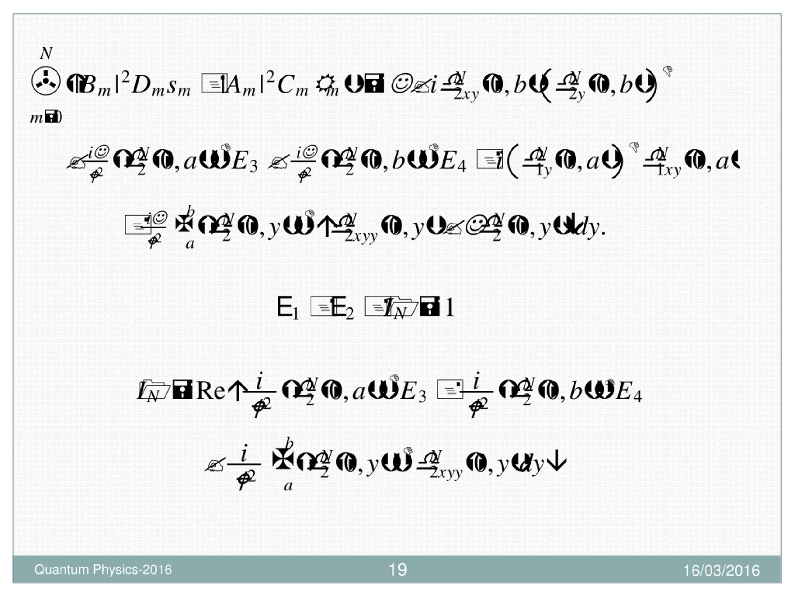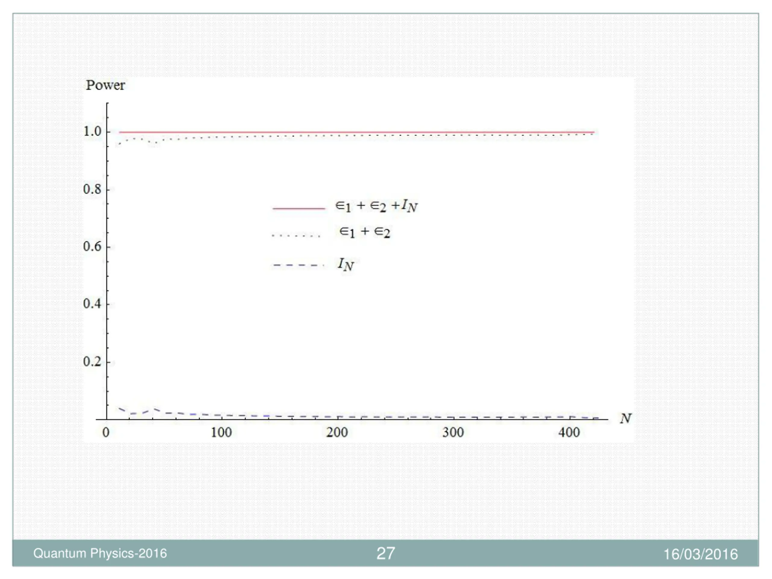 N m 0 |Bm|2Dmsm |Am|2Cm m i 2xy N 0,b 2y N 0,b 1xy E3 i E4 i 1y i N 0,a N 0,b N 0,a N 0,a 2 2 2 2 b 2 2xyy 2 i N 0,y N N 0,y dy. 0,y 2 a E1 E2 I N 1 N Re i E3 i N 0,a N 0,b E4 I 2 2 2 2 2 b 2 i 2xyy N 0,y N 0,y dy a 19 16/03/2016 Quantum Physics-2016
