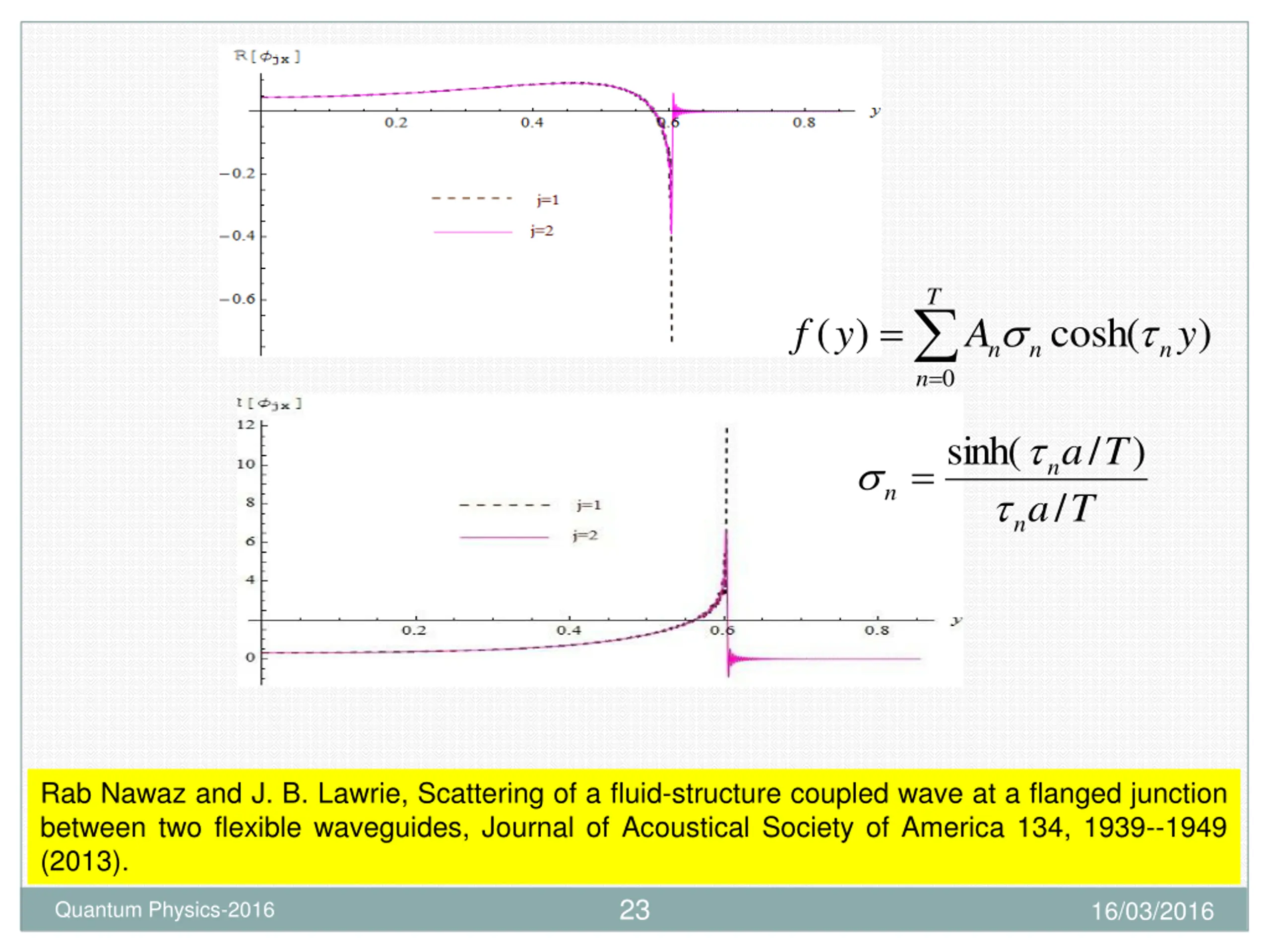 T = n = ( ) cosh( ) f y A y n n n 0 sinh( / ) a / T = n n a T n Rab Nawaz and J. B. Lawrie, Scattering of a fluid-structure coupled wave at a flanged junction between two flexible waveguides, Journal of Acoustical Society of America 134, 1939--1949 (2013). 23 16/03/2016 Quantum Physics-2016