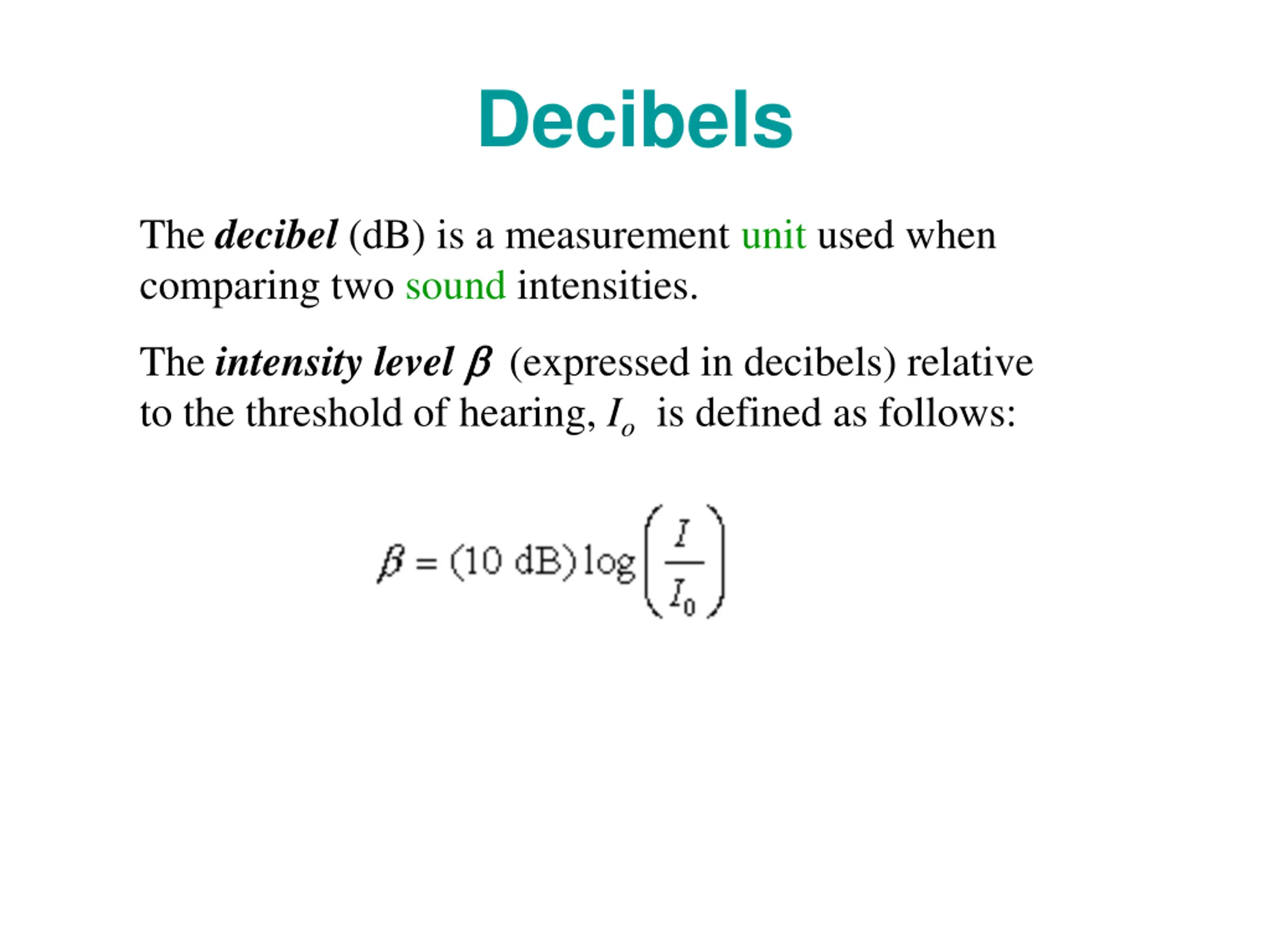 Decibels The decibel (dB) is a measurement unit used when comparing two sound intensities. The intensity level (expressed in decibels) relative to the threshold of hearing, Io is defined as follows: