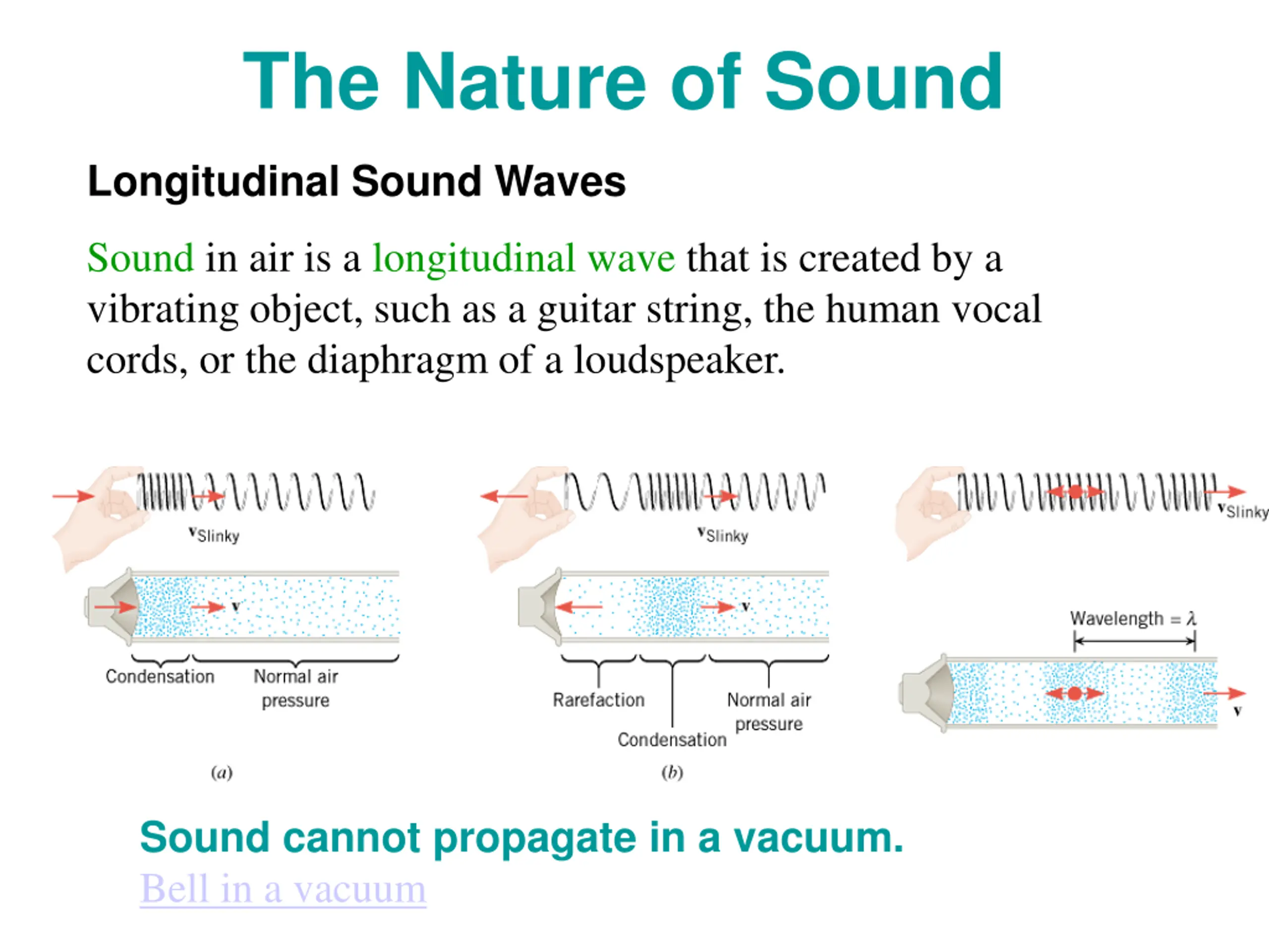 The Nature of Sound Longitudinal Sound Waves Sound in air is a longitudinal wave that is created by a vibrating object, such as a guitar string, the human vocal cords, or the diaphragm of a loudspeaker. Sound cannot propagate in a vacuum. Bell in a vacuum