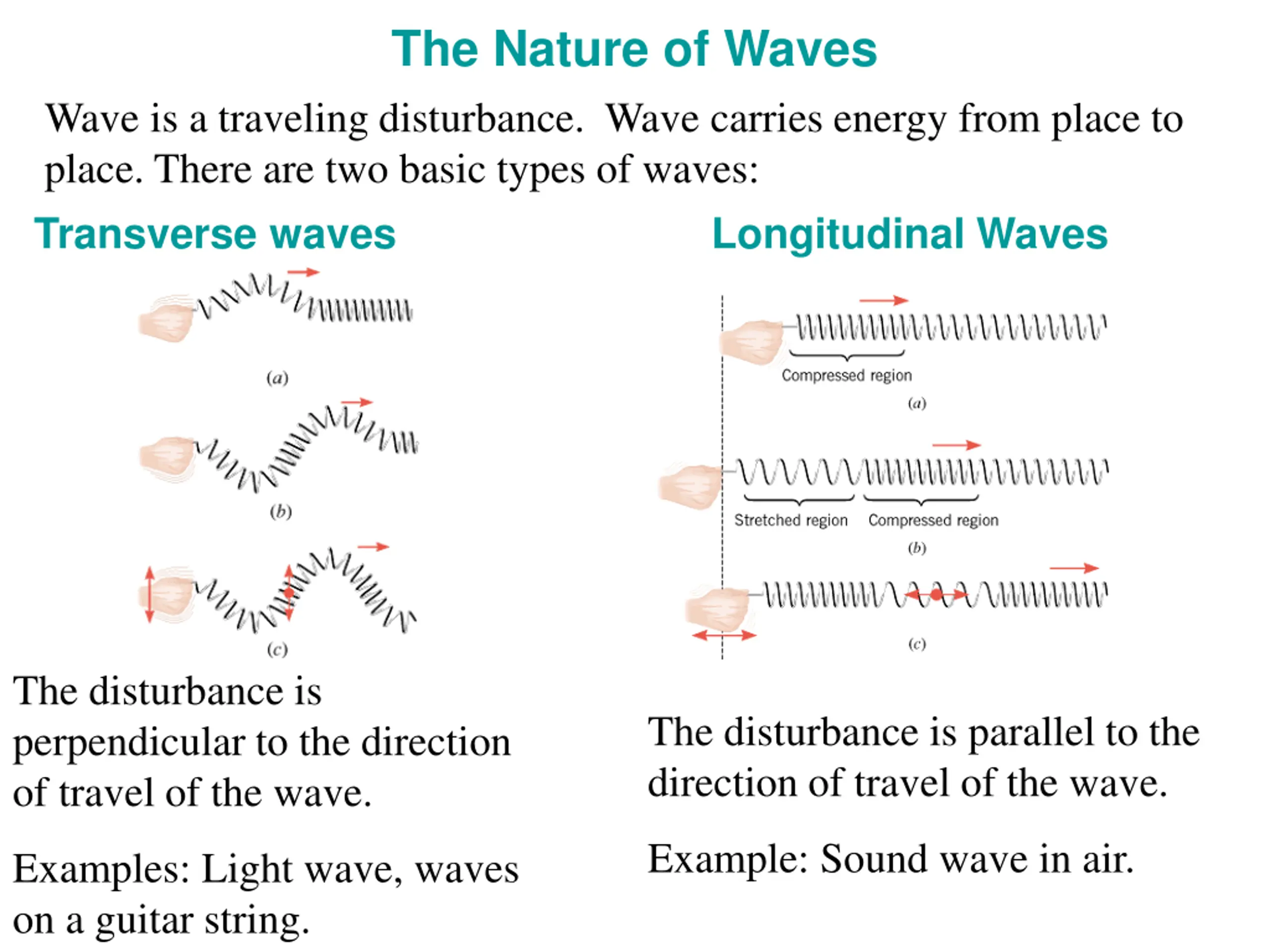 The Nature of Waves Wave is a traveling disturbance. Wave carries energy from place to place. There are two basic types of waves: Transverse waves Longitudinal Waves The disturbance is perpendicular to the direction of travel of the wave. The disturbance is parallel to the direction of travel of the wave. Example: Sound wave in air. Examples: Light wave, waves on a guitar string.
