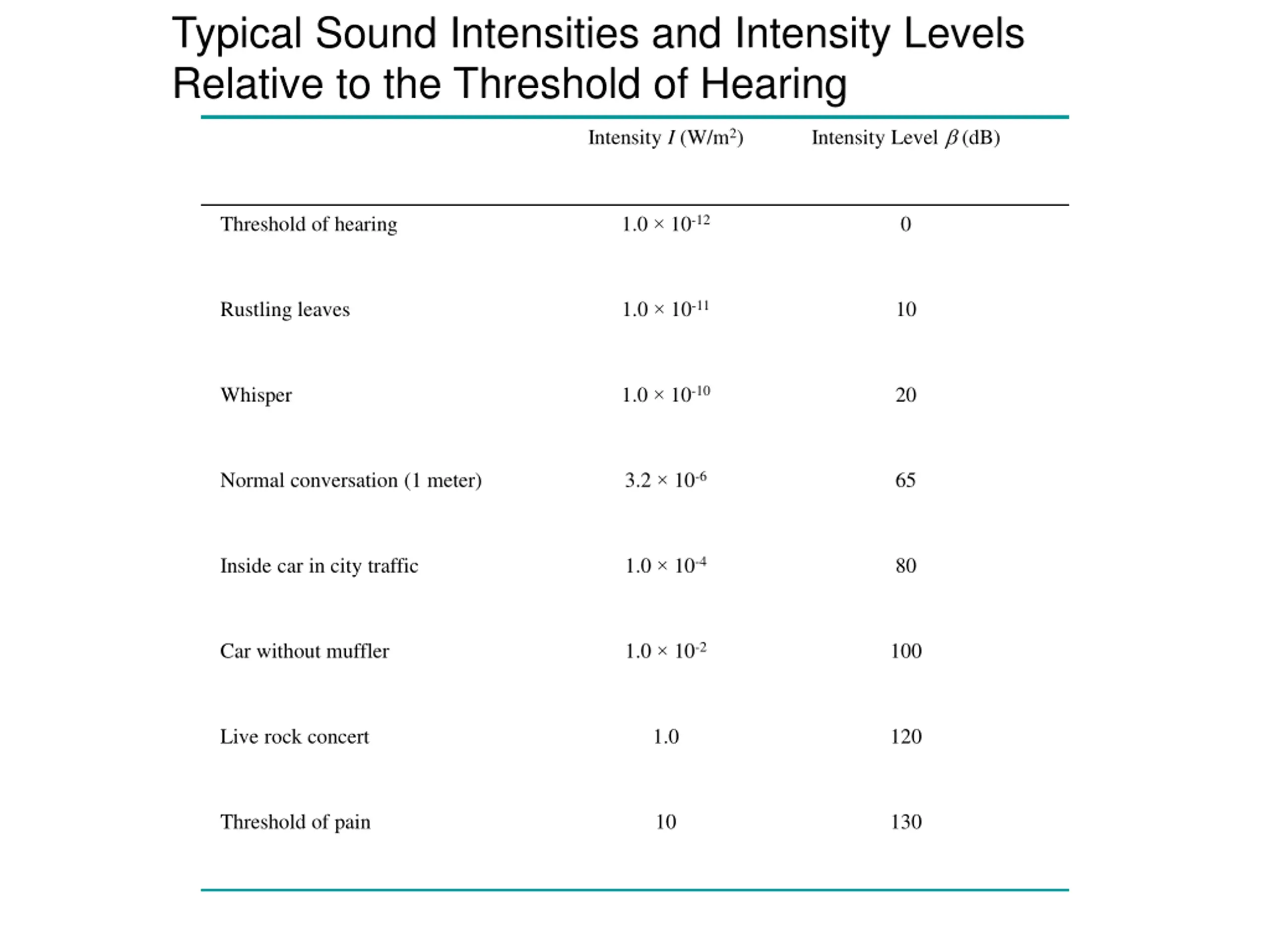 Typical Sound Intensities and Intensity Levels Relative to the Threshold of Hearing Intensity Level (dB) Intensity I (W/m2) Threshold of hearing 1.0 10-12 0 Rustling leaves 1.0 10-11 10 Whisper 1.0 10-10 20 Normal conversation (1 meter) 3.2 10-6 65 Inside car in city traffic 1.0 10-4 80 Car without muffler 1.0 10-2 100 Live rock concert 1.0 120 Threshold of pain 10 130