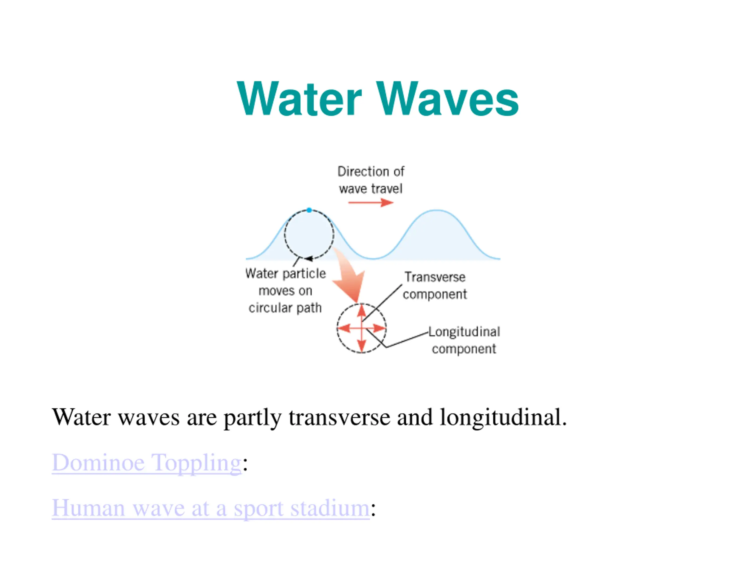 Water Waves Water waves are partly transverse and longitudinal. Dominoe Toppling: Human wave at a sport stadium: