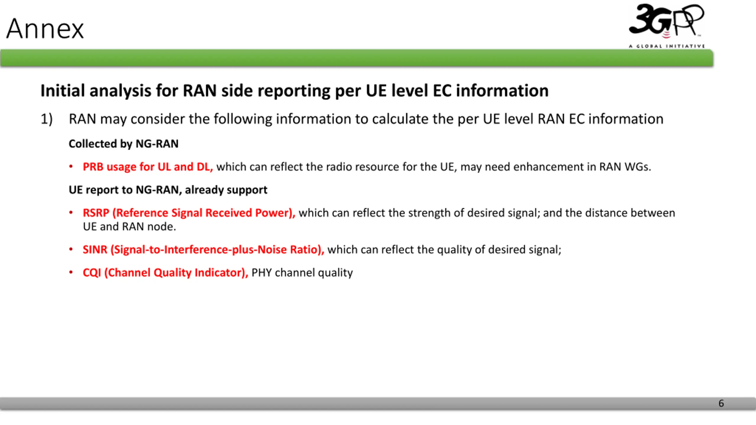 Annex Initial analysis for RAN side reporting per UE level EC information 1) RAN may consider the following information to calculate the per UE level RAN EC information Collected by NG-RAN PRB usage for UL and DL, which can reflect the radio resource for the UE, may need enhancement in RAN WGs. UE report to NG-RAN, already support RSRP (Reference Signal Received Power), which can reflect the strength of desired signal; and the distance between UE and RAN node. SINR (Signal-to-Interference-plus-Noise Ratio), which can reflect the quality of desired signal; CQI (Channel Quality Indicator), PHY channel quality 6