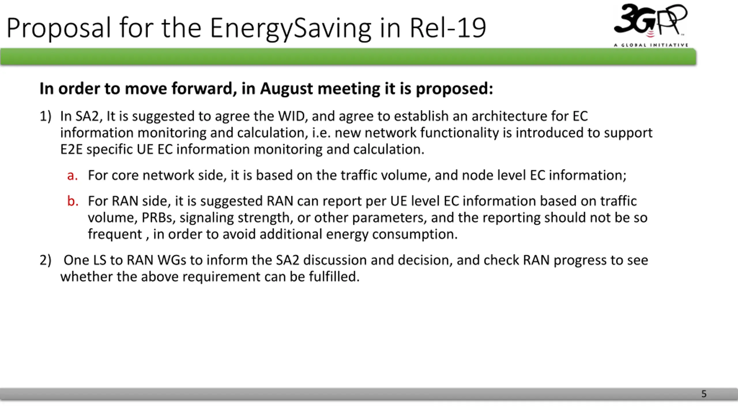 Proposal for the EnergySaving in Rel-19 In order to move forward, in August meeting it is proposed: 1) In SA2, It is suggested to agree the WID, and agree to establish an architecture for EC information monitoring and calculation, i.e. new network functionality is introduced to support E2E specific UE EC information monitoring and calculation. a. For core network side, it is based on the traffic volume, and node level EC information; b. For RAN side, it is suggested RAN can report per UE level EC information based on traffic volume, PRBs, signaling strength, or other parameters, and the reporting should not be so frequent , in order to avoid additional energy consumption. 2) One LS to RAN WGs to inform the SA2 discussion and decision, and check RAN progress to see whether the above requirement can be fulfilled. 5
