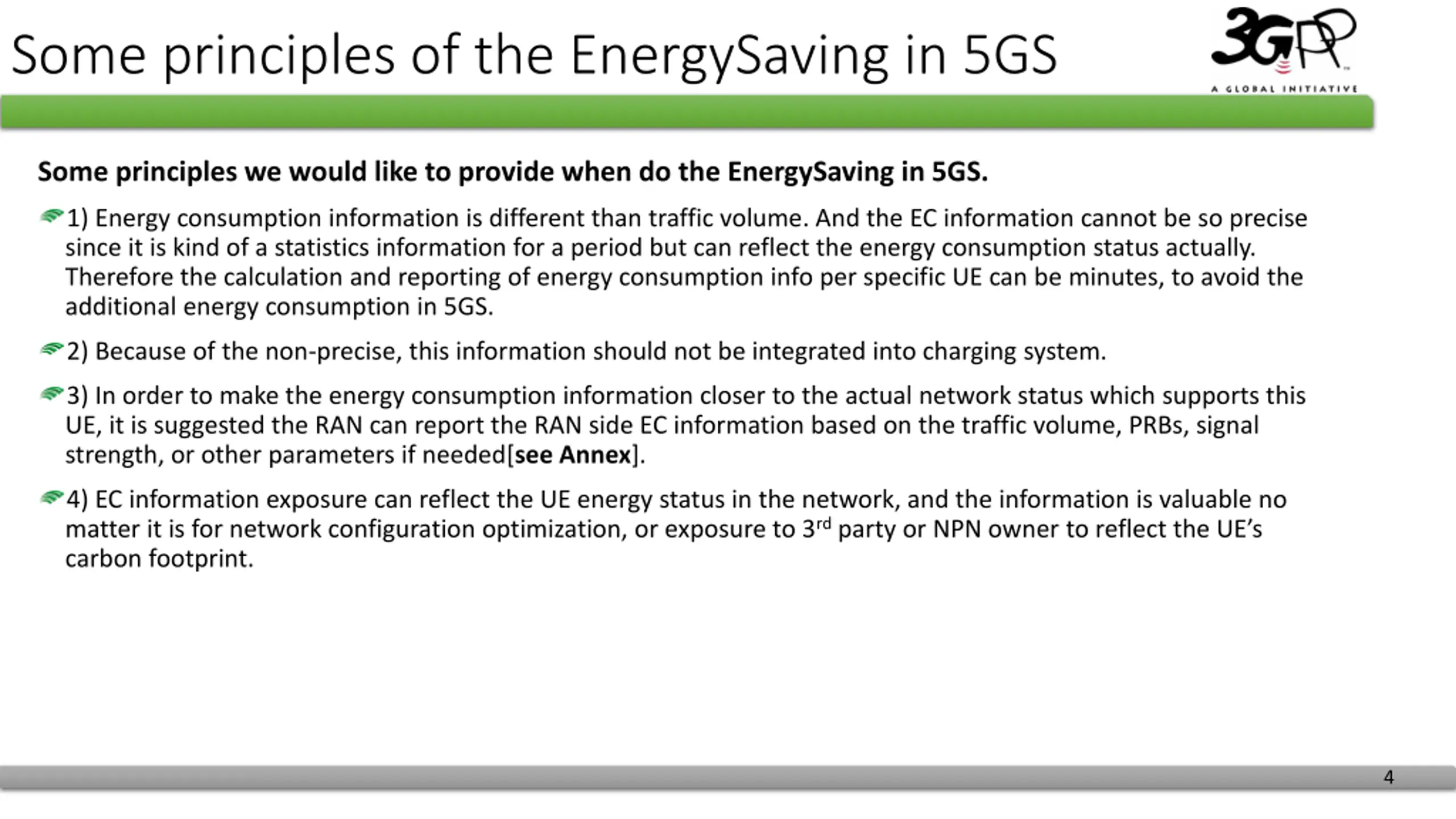 Some principles of the EnergySaving in 5GS Some principles we would like to provide when do the EnergySaving in 5GS. 1) Energy consumption information is different than traffic volume. And the EC information cannot be so precise since it is kind of a statistics information for a period but can reflect the energy consumption status actually. Therefore the calculation and reporting of energy consumption info per specific UE can be minutes, to avoid the additional energy consumption in 5GS. 2) Because of the non-precise, this information should not be integrated into charging system. 3) In order to make the energy consumption information closer to the actual network status which supports this UE, it is suggested the RAN can report the RAN side EC information based on the traffic volume, PRBs, signal strength, or other parameters if needed[see Annex]. 4) EC information exposure can reflect the UE energy status in the network, and the information is valuable no matter it is for network configuration optimization, or exposure to 3rdparty or NPN owner to reflect the UE s carbon footprint. 4