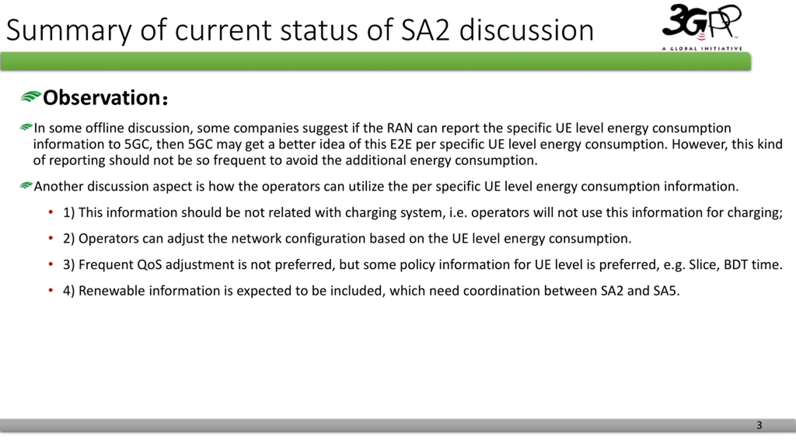 Summary of current status of SA2 discussion Observation In some offline discussion, some companies suggest if the RAN can report the specific UE level energy consumption information to 5GC, then 5GC may get a better idea of this E2E per specific UE level energy consumption. However, this kind of reporting should not be so frequent to avoid the additional energy consumption. Another discussion aspect is how the operators can utilize the per specific UE level energy consumption information. 1) This information should be not related with charging system, i.e. operators will not use this information for charging; 2) Operators can adjust the network configuration based on the UE level energy consumption. 3) Frequent QoS adjustment is not preferred, but some policy information for UE level is preferred, e.g. Slice, BDT time. 4) Renewable information is expected to be included, which need coordination between SA2 and SA5. 3