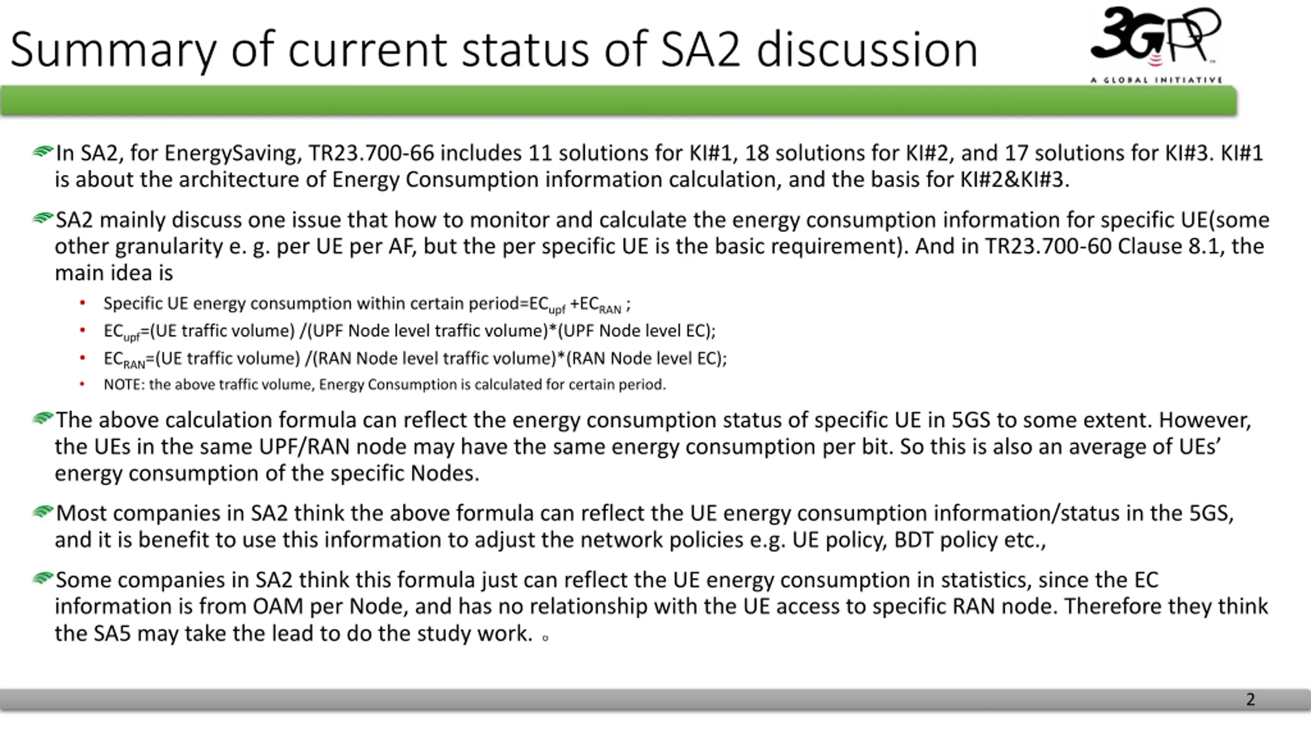 Summary of current status of SA2 discussion In SA2, for EnergySaving, TR23.700-66 includes 11 solutions for KI#1, 18 solutions for KI#2, and 17 solutions for KI#3. KI#1 is about the architecture of Energy Consumption information calculation, and the basis for KI#2&KI#3. SA2 mainly discuss one issue that how to monitor and calculate the energy consumption information for specific UE(some other granularity e. g. per UE per AF, but the per specific UE is the basic requirement). And in TR23.700-60 Clause 8.1, the main idea is Specific UE energy consumption within certain period=ECupf+ECRAN; ECupf=(UE traffic volume) /(UPF Node level traffic volume)*(UPF Node level EC); ECRAN=(UE traffic volume) /(RAN Node level traffic volume)*(RAN Node level EC); NOTE: the above traffic volume, Energy Consumption is calculated for certain period. The above calculation formula can reflect the energy consumption status of specific UE in 5GS to some extent. However, the UEs in the same UPF/RAN node may have the same energy consumption per bit. So this is also an average of UEs energy consumption of the specific Nodes. Most companies in SA2 think the above formula can reflect the UE energy consumption information/status in the 5GS, and it is benefit to use this information to adjust the network policies e.g. UE policy, BDT policy etc., Some companies in SA2 think this formula just can reflect the UE energy consumption in statistics, since the EC information is from OAM per Node, and has no relationship with the UE access to specific RAN node. Therefore they think the SA5 may take the lead to do the study work. 2