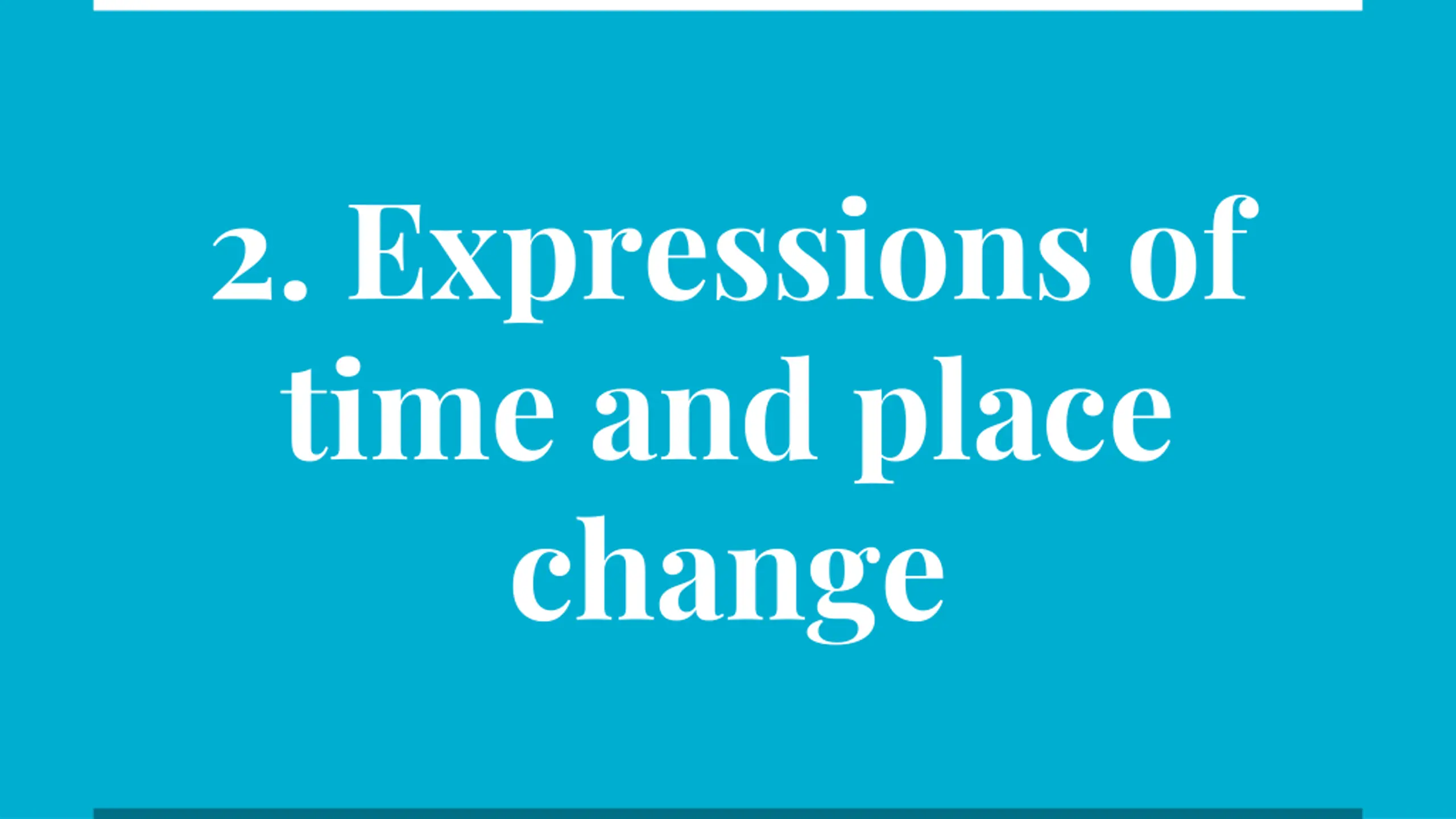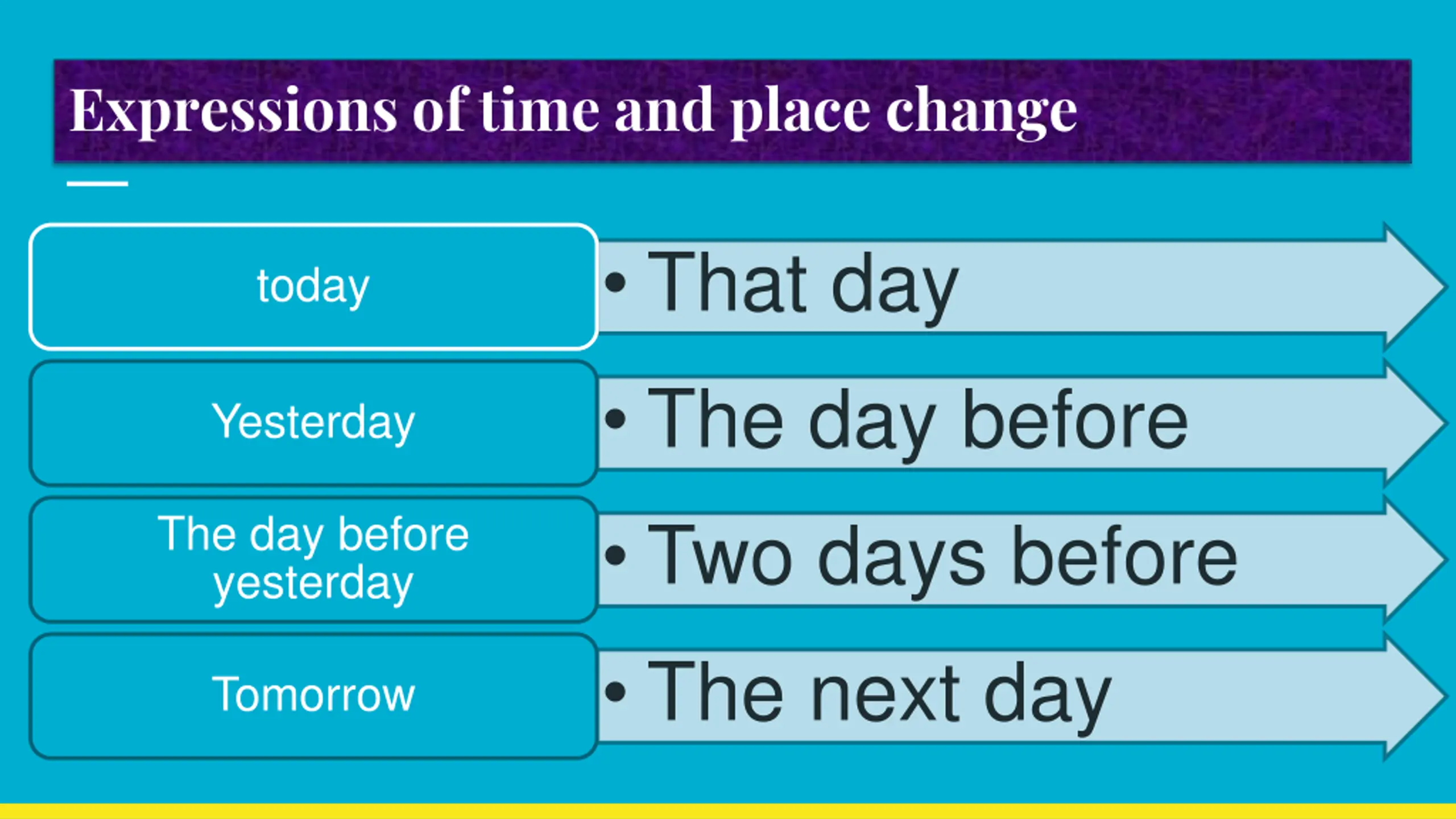 Expressions of time and place change That day today The day before Yesterday The day before yesterday Two days before The next day Tomorrow