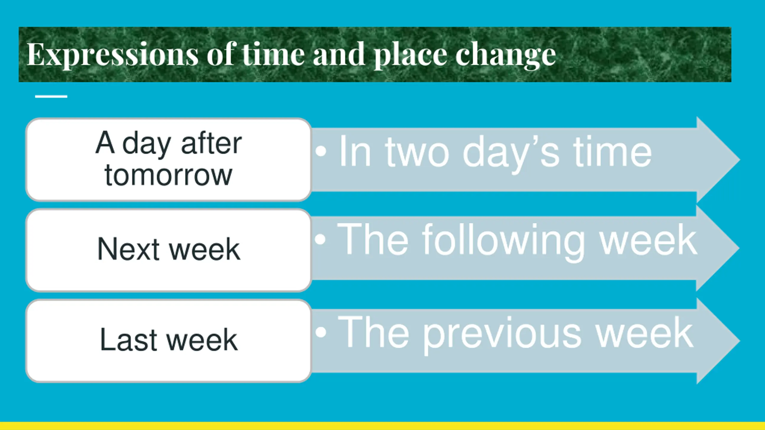 Expressions of time and place change A day after tomorrow In two day s time The following week Next week The previous week Last week