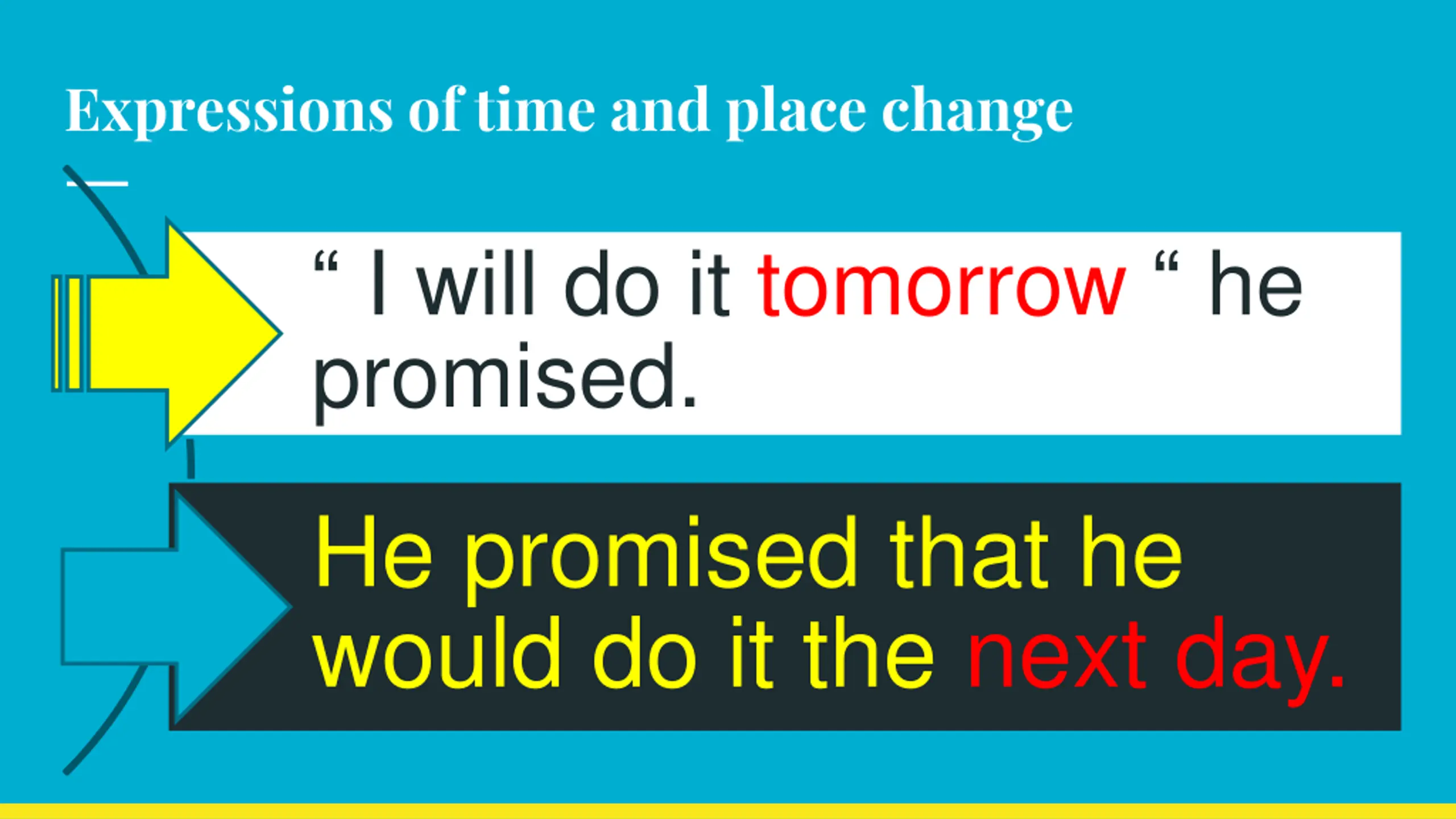 Expressions of time and place change I will do it tomorrow he promised. He promised that he would do it the next day.