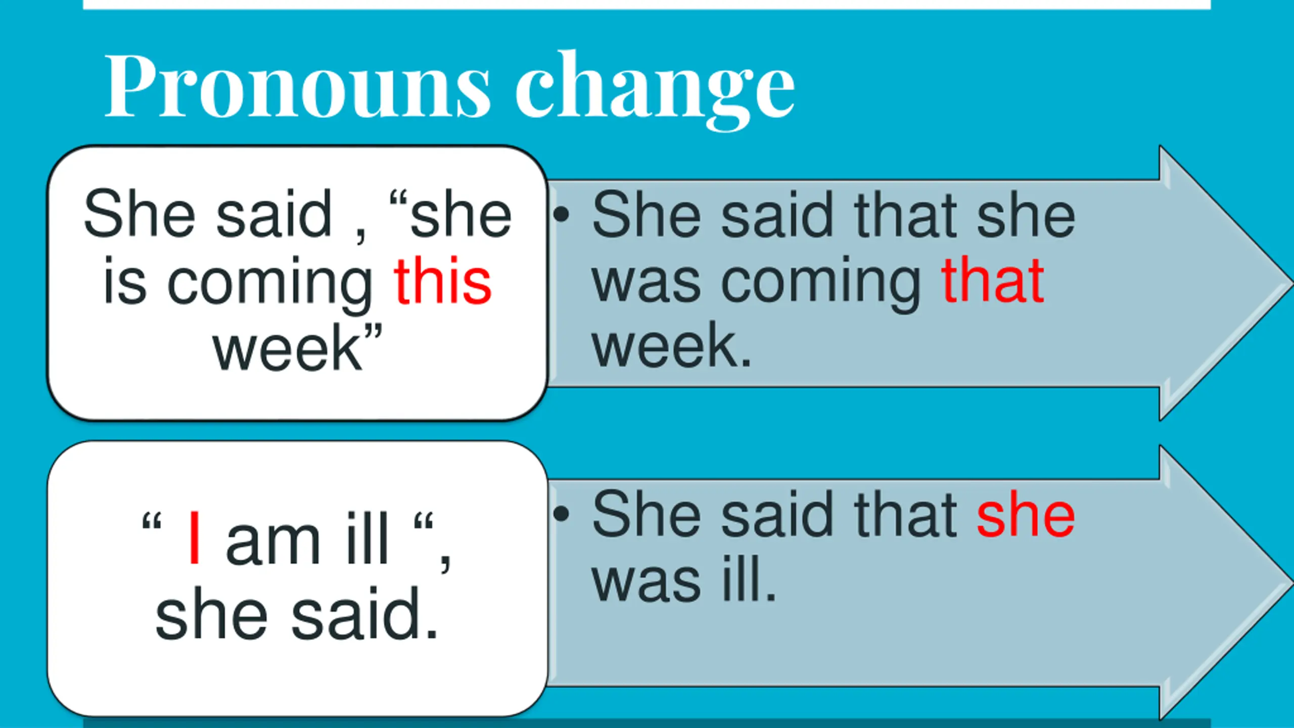 Pronouns change She said , she is coming this week She said that she was coming that week. She said that she was ill. I am ill , she said.