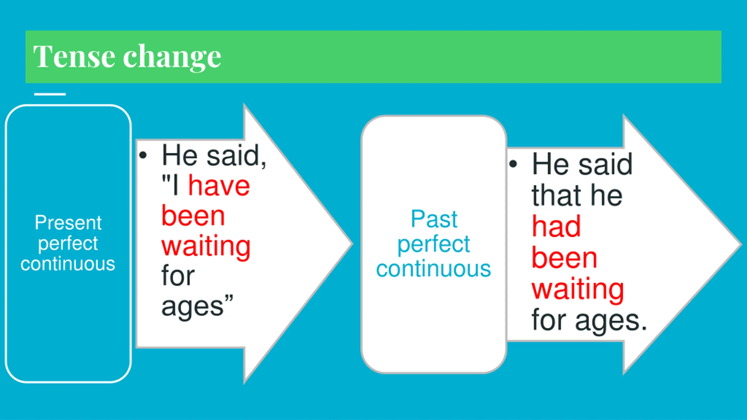 Tense change He said, "I have been waiting for ages He said that he had been waiting for ages. Past perfect continuous Present perfect continuous