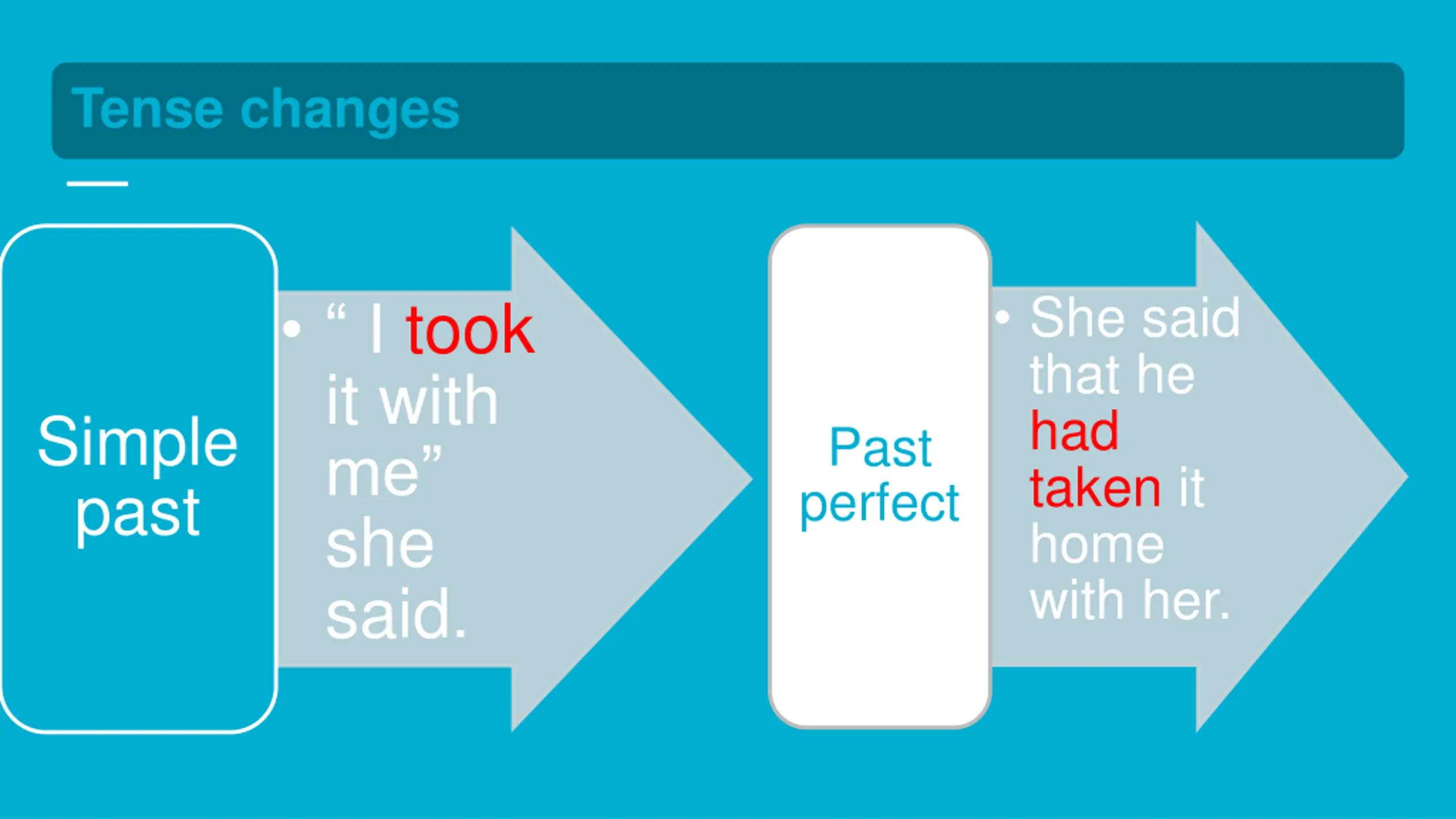 Tense changes She said that he had taken it home with her. I took it with me she said. Simple past Past perfect