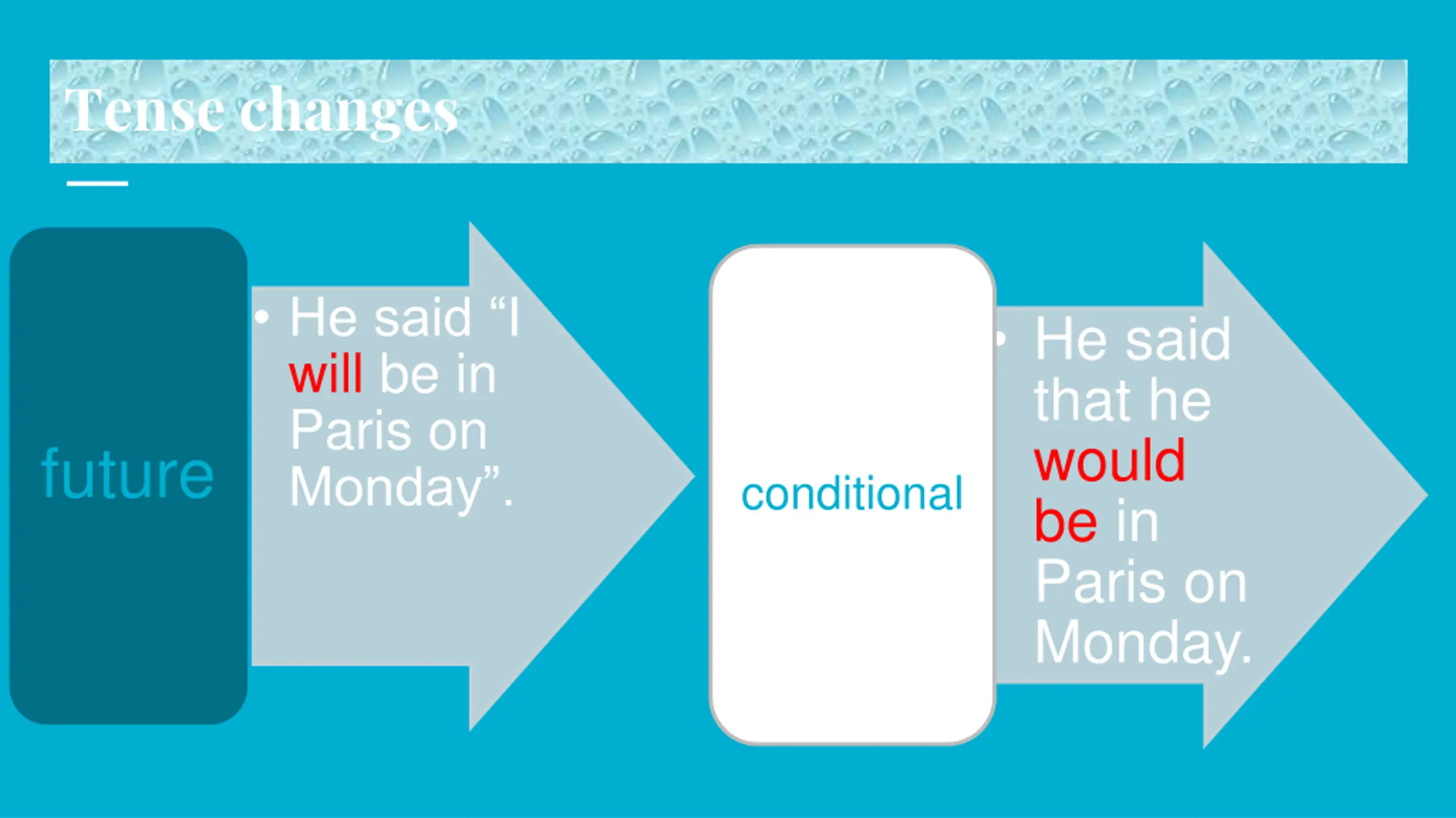 Tense changes He said I will be in Paris on Monday . He said that he would be in Paris on Monday. future conditional