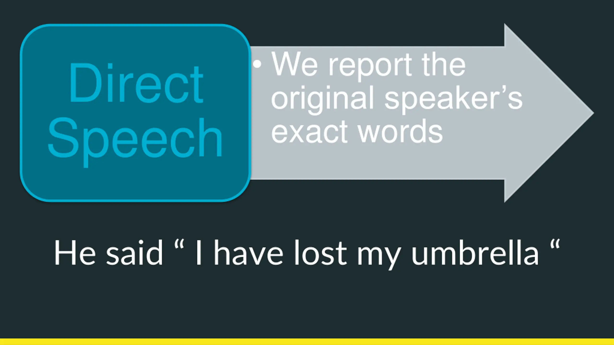 We report the original speaker s exact words Direct Speech He said I have lost my umbrella