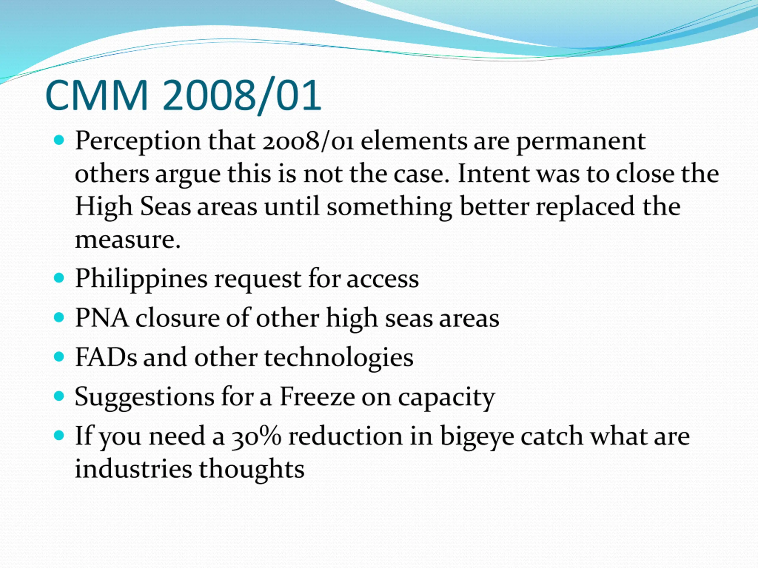 CMM 2008/01 Perception that 2008/01 elements are permanent others argue this is not the case. Intent was to close the High Seas areas until something better replaced the measure. Philippines request for access PNA closure of other high seas areas FADs and other technologies Suggestions for a Freeze on capacity If you need a 30% reduction in bigeye catch what are industries thoughts