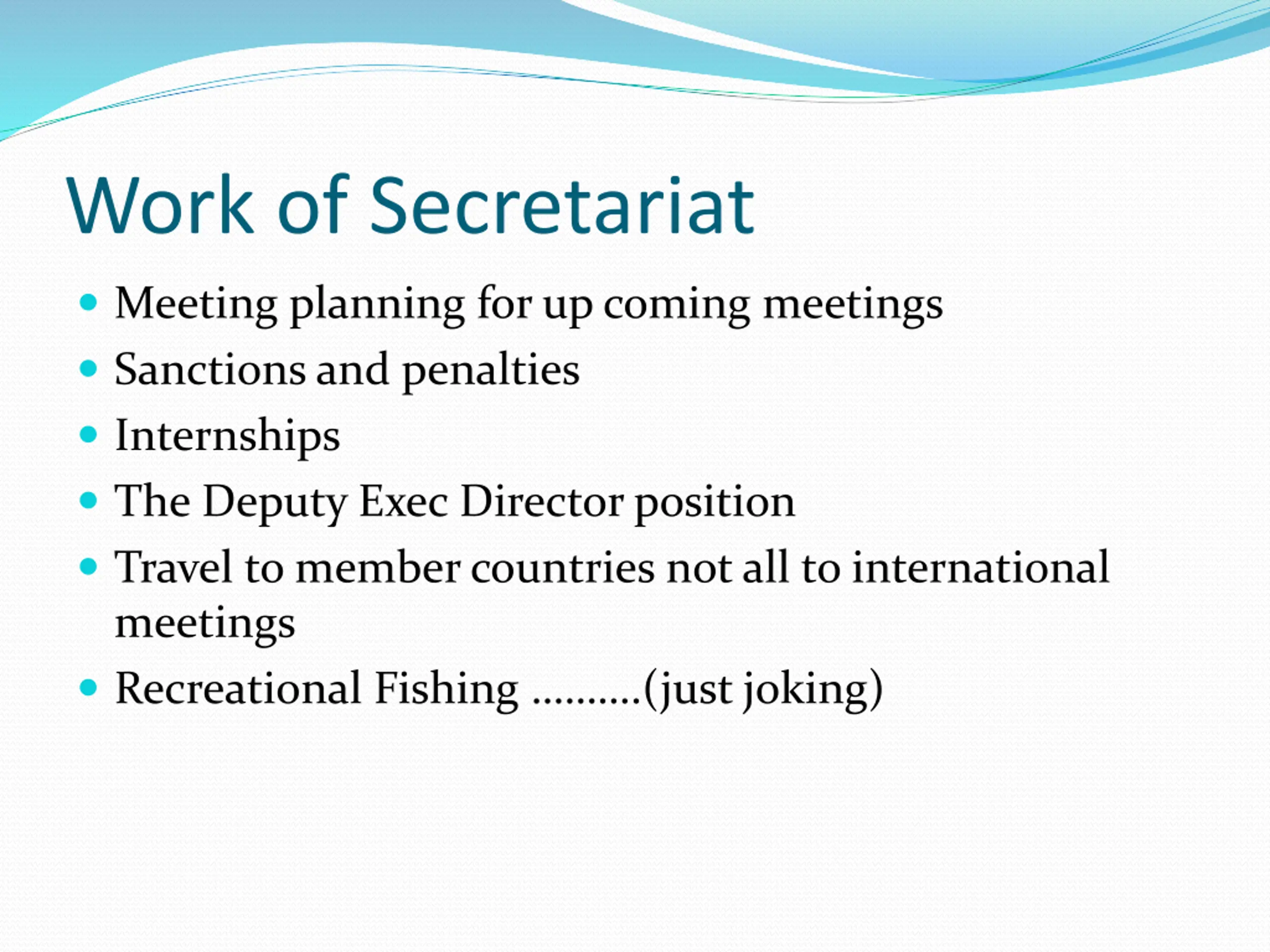 Work of Secretariat Meeting planning for up coming meetings Sanctions and penalties Internships The Deputy Exec Director position Travel to member countries not all to international meetings Recreational Fishing .(just joking)