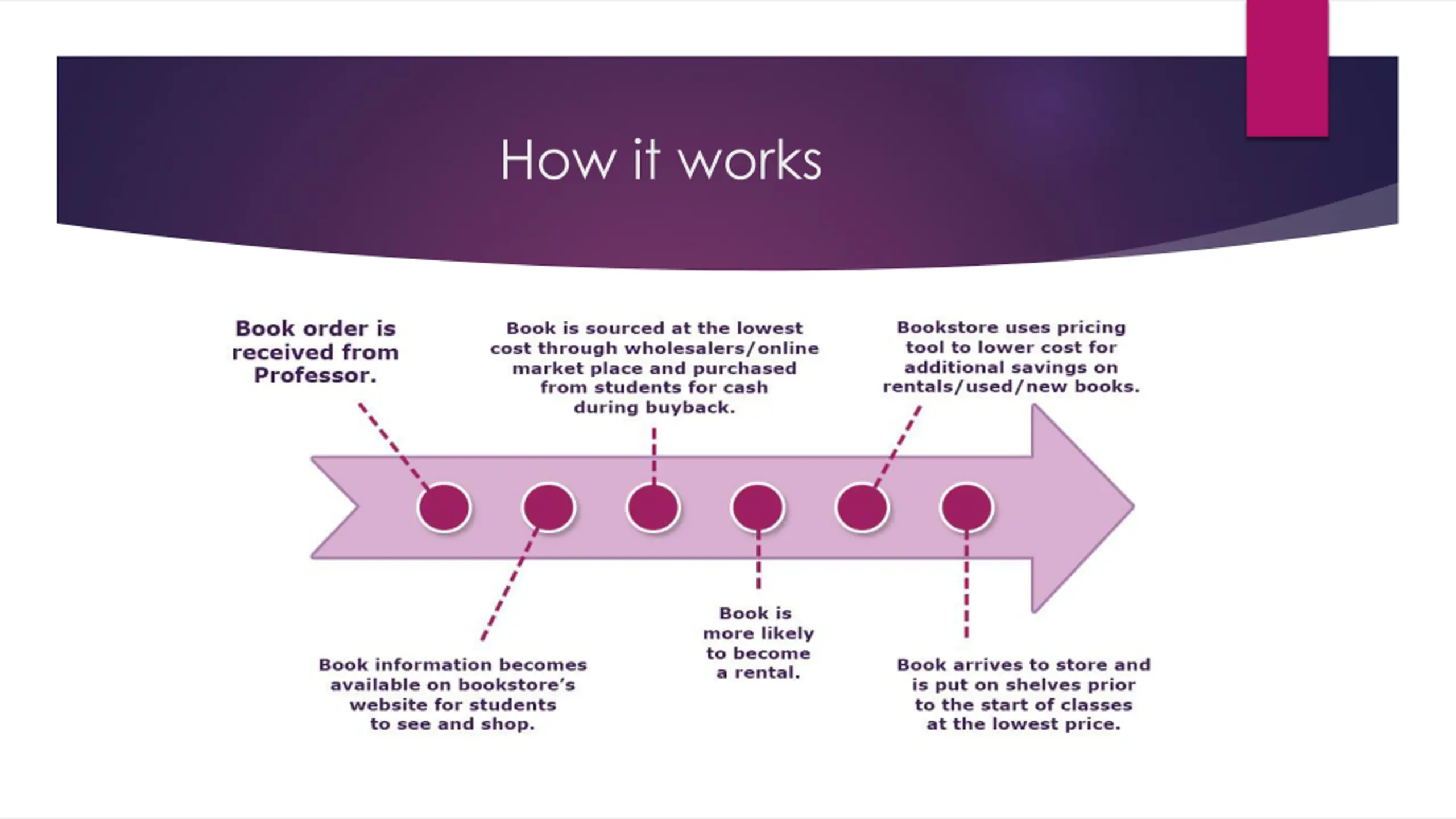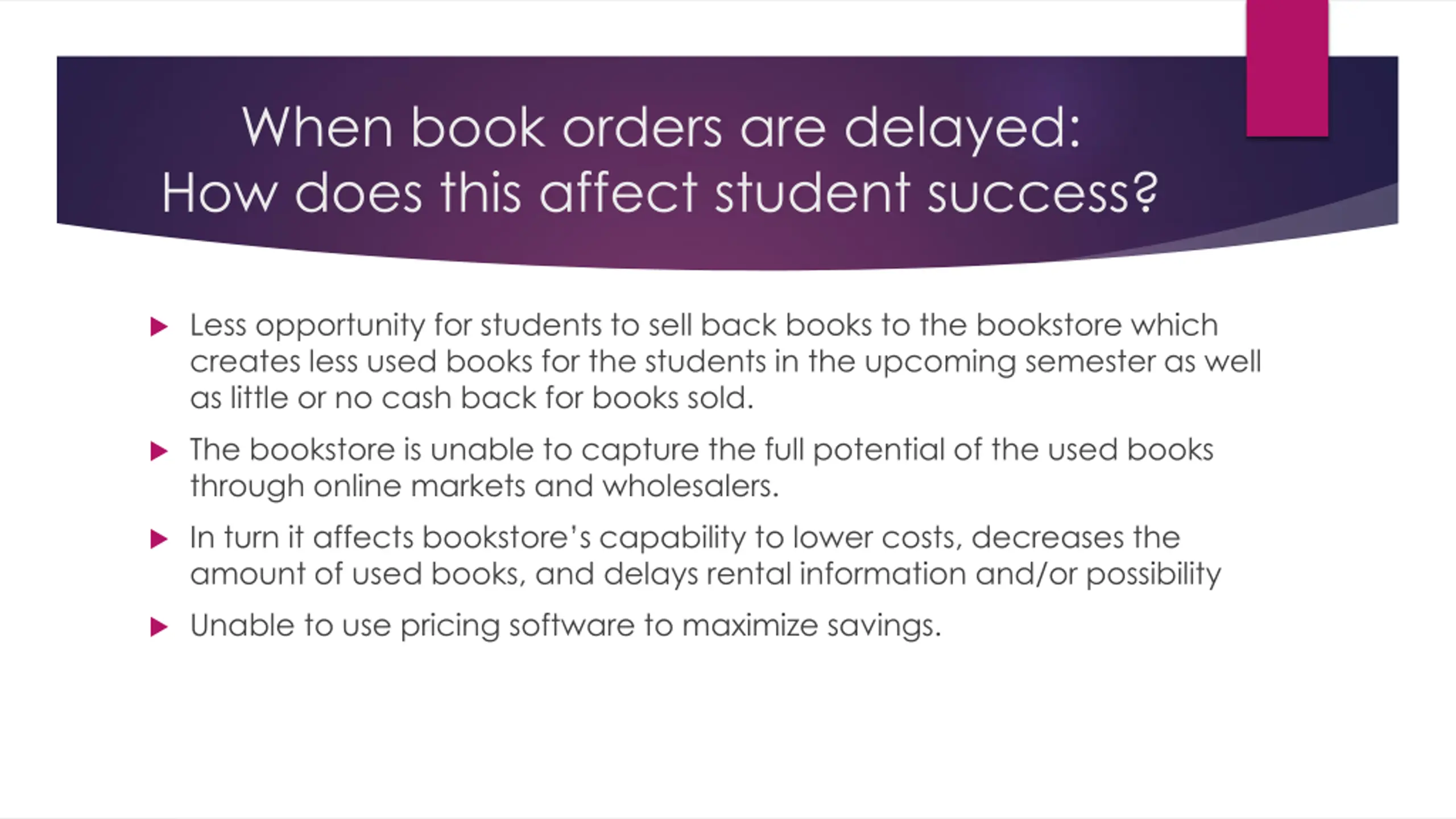 When book orders are delayed: How does this affect student success? Less opportunity for students to sell back books to the bookstore which creates less used books for the students in the upcoming semester as well as little or no cash back for books sold. The bookstore is unable to capture the full potential of the used books through online markets and wholesalers. In turn it affects bookstore s capability to lower costs, decreases the amount of used books, and delays rental information and/or possibility Unable to use pricing software to maximize savings.