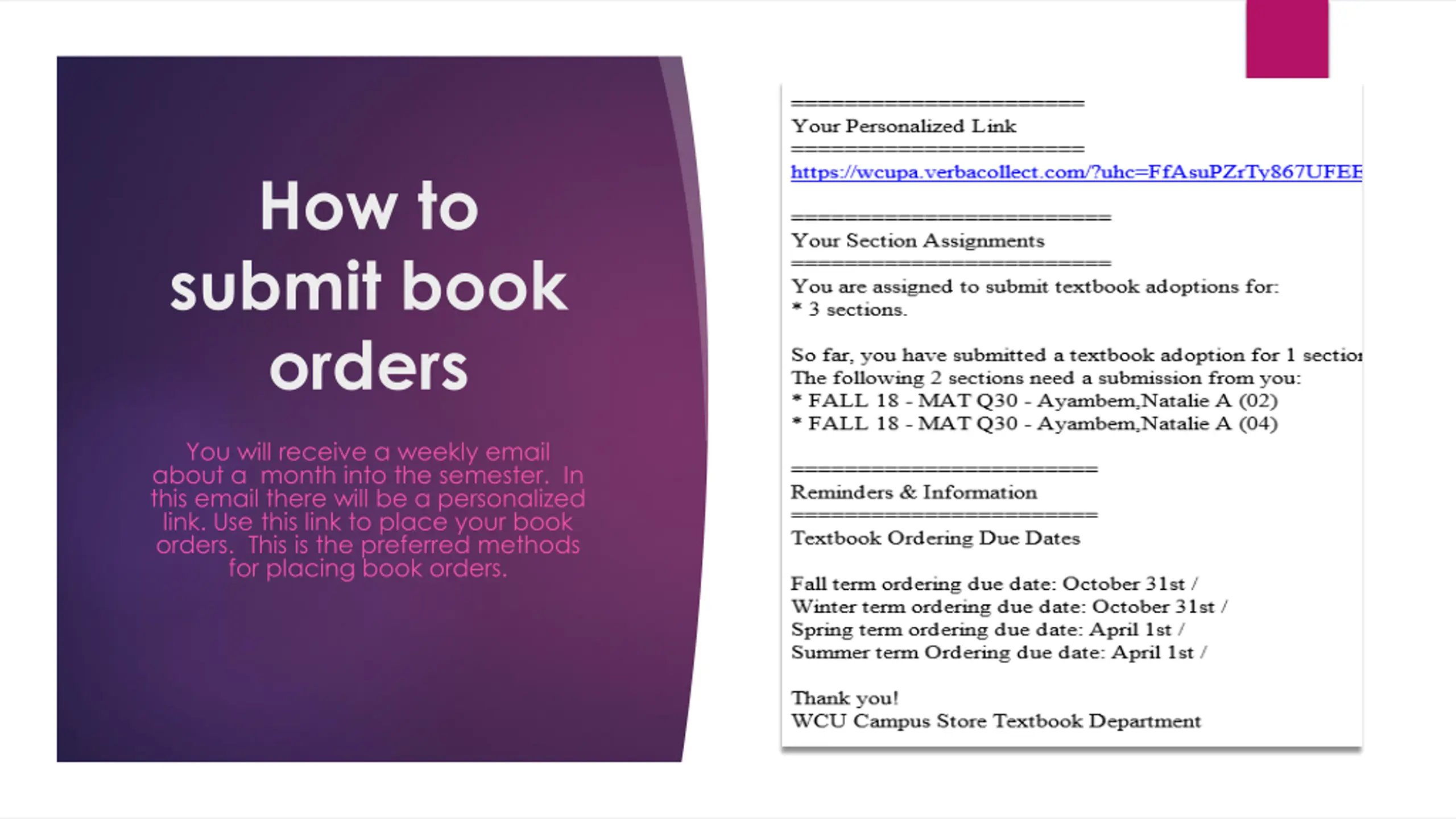 How to submit book orders You will receive a weekly email about a month into the semester. In this email there will be a personalized link. Use this link to place your book orders. This is the preferred methods for placing book orders.