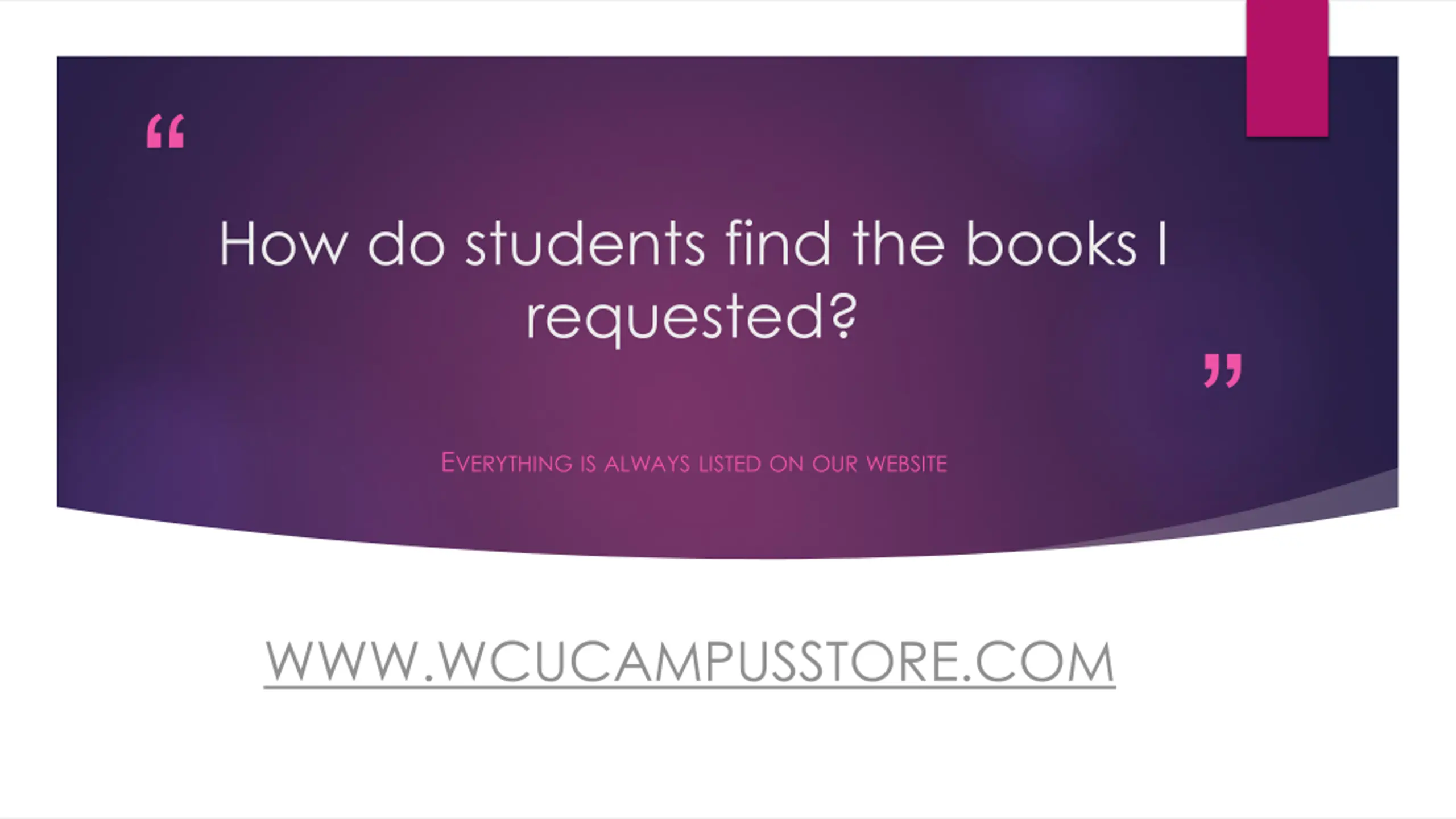 How do students find the books I requested? EVERYTHINGISALWAYSLISTEDONOURWEBSITE WWW.WCUCAMPUSSTORE.COM
