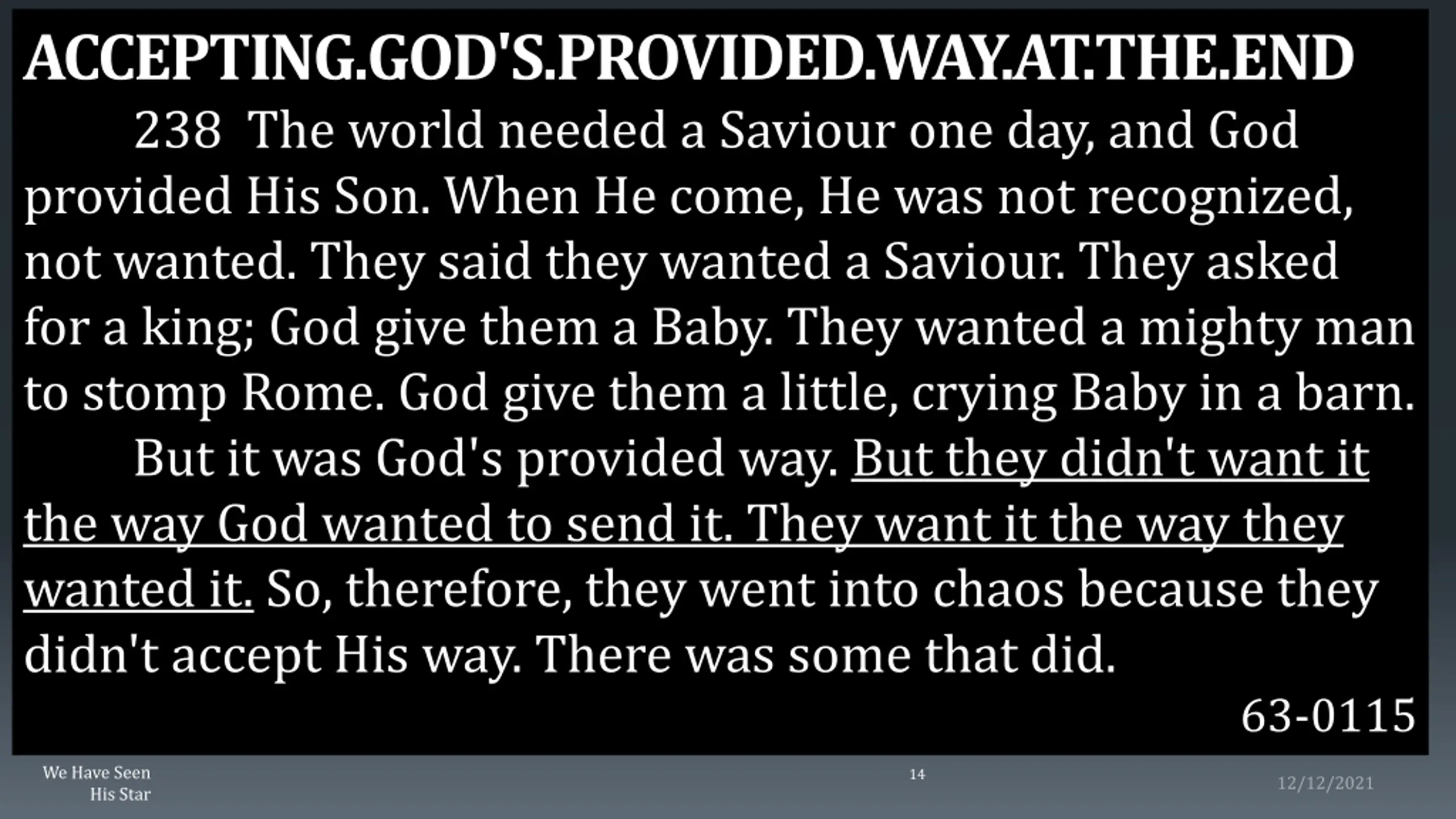 ACCEPTING.GOD'S.PROVIDED.WAY.AT.THE.END 238 The world needed a Saviour one day, and God provided His Son. When He come, He was not recognized, not wanted. They said they wanted a Saviour. They asked for a king; God give them a Baby. They wanted a mighty man to stomp Rome. God give them a little, crying Baby in a barn. But it was God's provided way. But they didn't want it the way God wanted to send it. They want it the way they wanted it. So, therefore, they went into chaos because they didn't accept His way. There was some that did. 63-0115 We Have Seen His Star 14