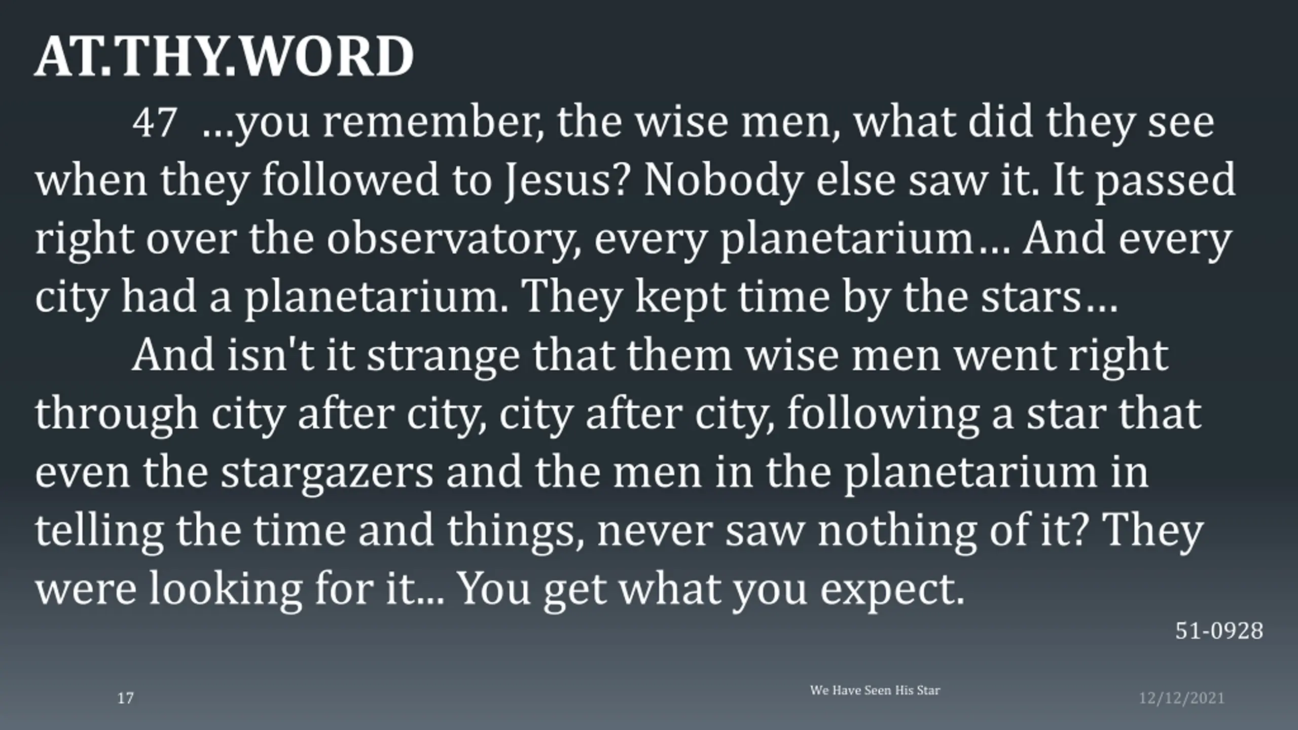 AT.THY.WORD 47 you remember, the wise men, what did they see when they followed to Jesus? Nobody else saw it. It passed right over the observatory, every planetarium And every city had a planetarium. They kept time by the stars And isn't it strange that them wise men went right through city after city, city after city, following a star that even the stargazers and the men in the planetarium in telling the time and things, never saw nothing of it? They were looking for it... You get what you expect. 51-0928 We Have Seen His Star 17