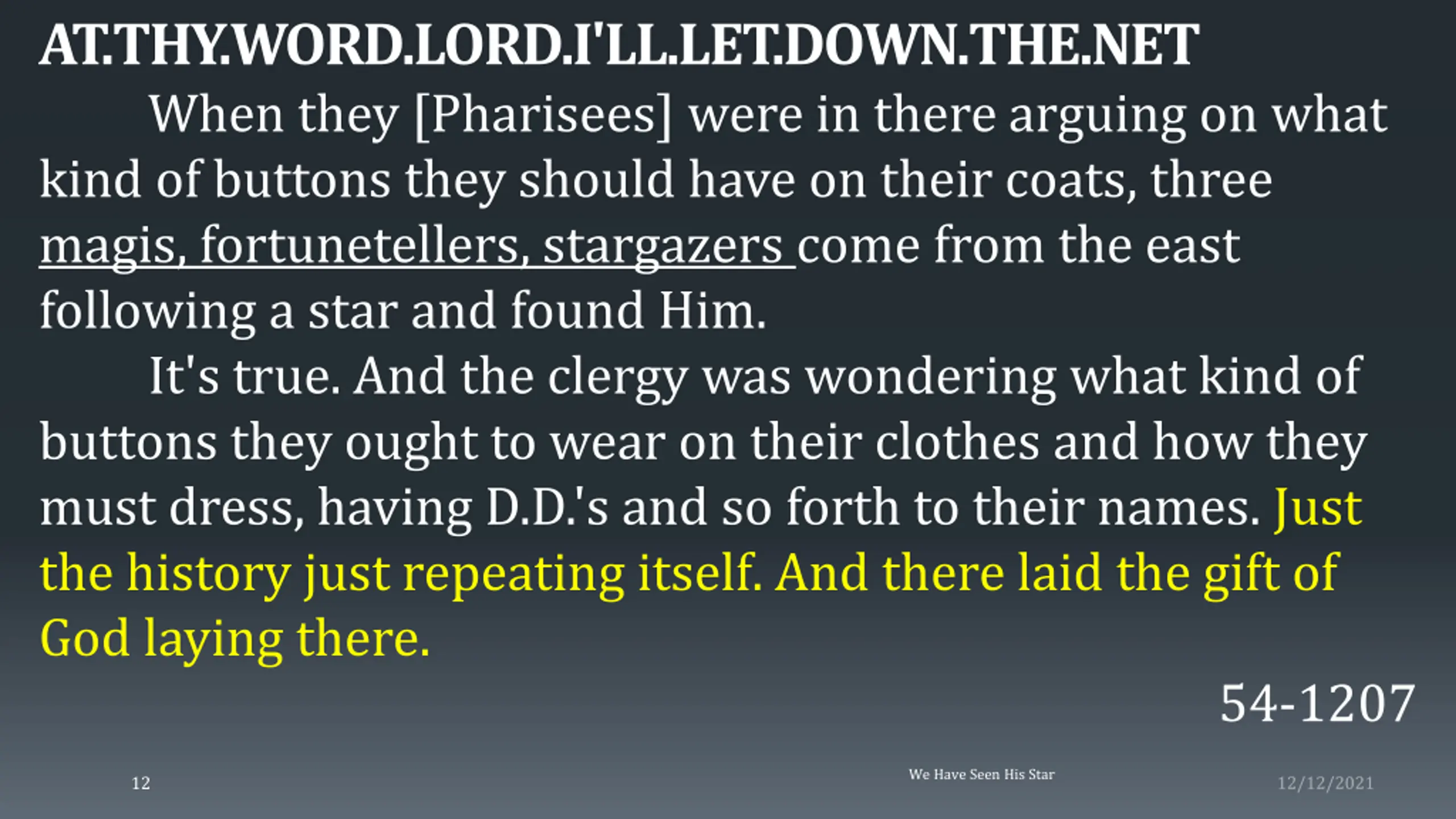 AT.THY.WORD.LORD.I'LL.LET.DOWN.THE.NET When they [Pharisees] were in there arguing on what kind of buttons they should have on their coats, three magis, fortunetellers, stargazers come from the east following a star and found Him. It's true. And the clergy was wondering what kind of buttons they ought to wear on their clothes and how they must dress, having D.D.'s and so forth to their names. Just the history just repeating itself. And there laid the gift of God laying there. 54-1207 We Have Seen His Star 12