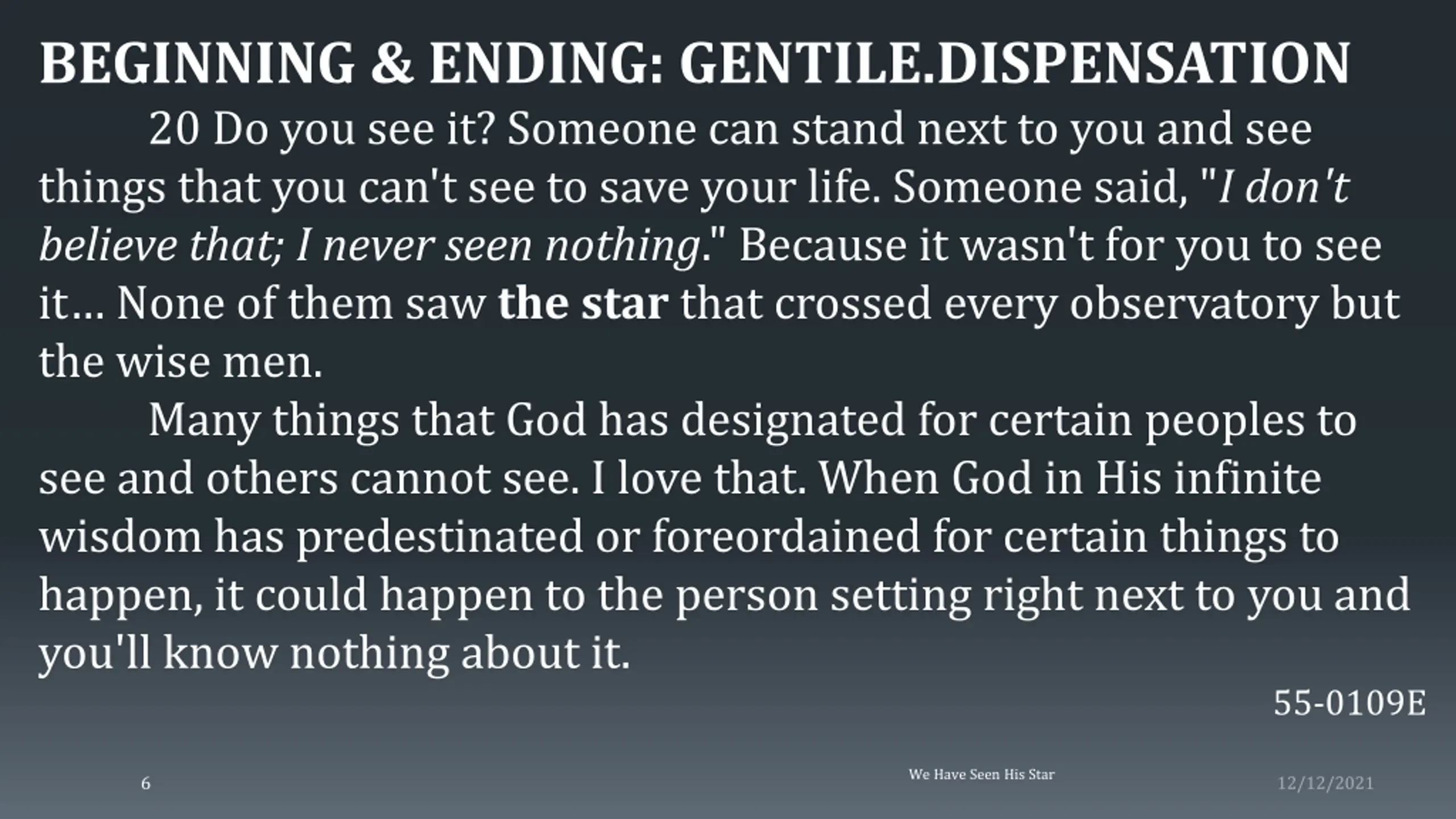 BEGINNING & ENDING: GENTILE.DISPENSATION 20 Do you see it? Someone can stand next to you and see things that you can't see to save your life. Someone said, "I don't believe that; I never seen nothing." Because it wasn't for you to see it None of them saw the star that crossed every observatory but the wise men. Many things that God has designated for certain peoples to see and others cannot see. I love that. When God in His infinite wisdom has predestinated or foreordained for certain things to happen, it could happen to the person setting right next to you and you'll know nothing about it. 55-0109E We Have Seen His Star 6