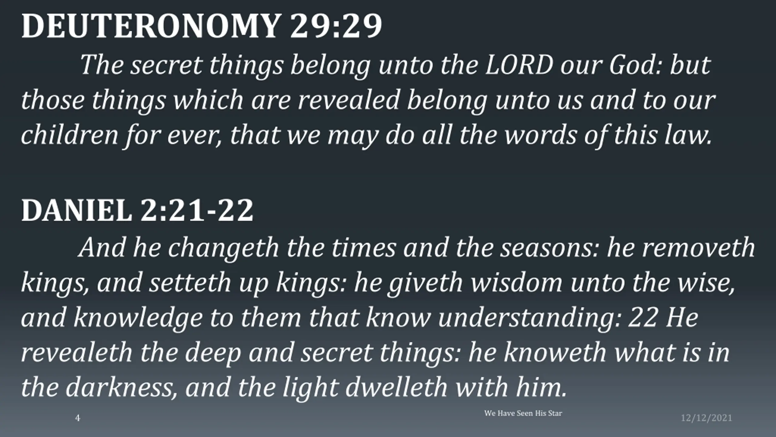 DEUTERONOMY 29:29 The secret things belong unto the LORD our God: but those things which are revealed belong unto us and to our children for ever, that we may do all the words of this law. DANIEL 2:21-22 And he changeth the times and the seasons: he removeth kings, and setteth up kings: he giveth wisdom unto the wise, and knowledge to them that know understanding: 22 He revealeth the deep and secret things: he knoweth what is in the darkness, and the light dwelleth with him. We Have Seen His Star 4