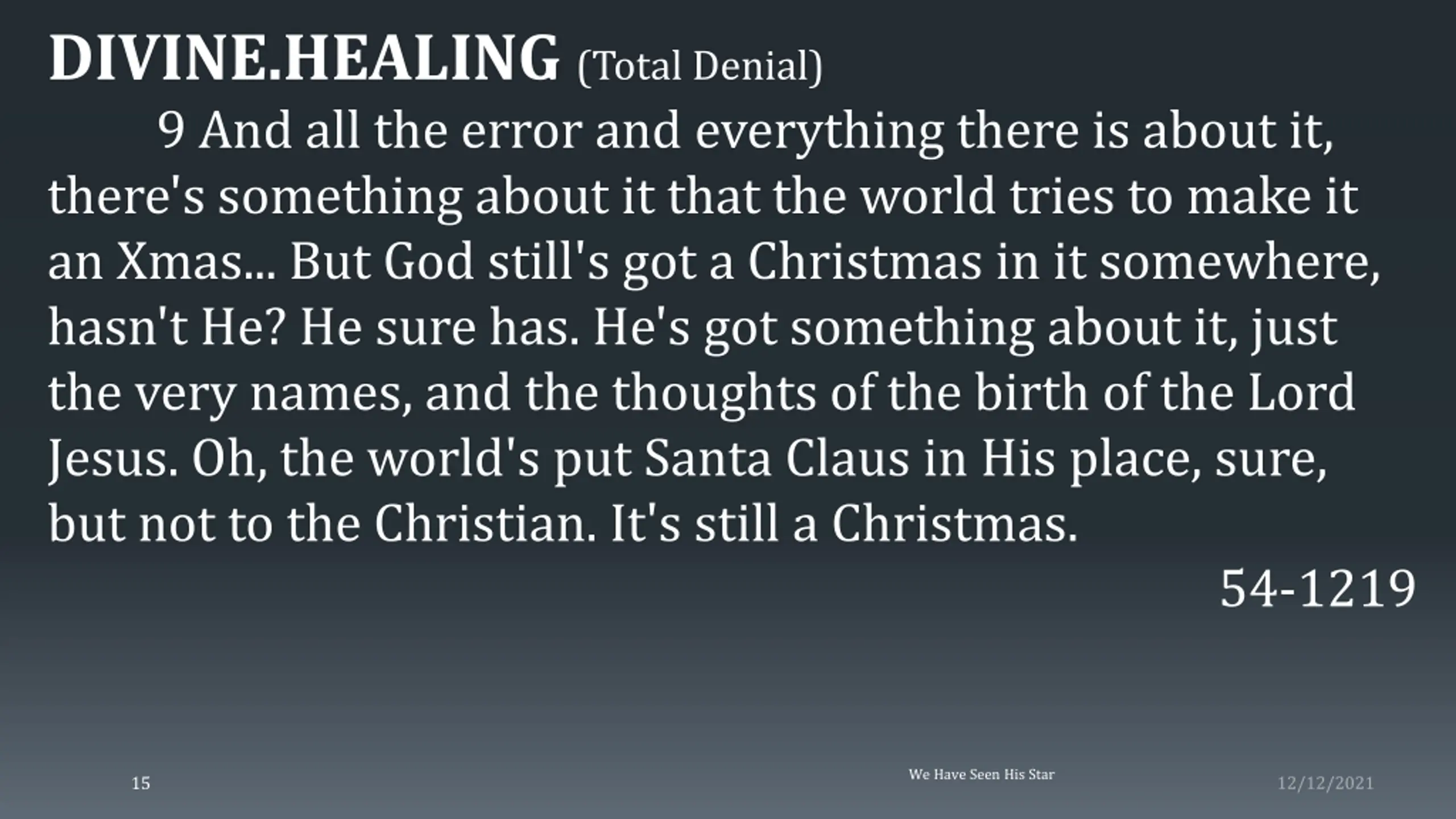 DIVINE.HEALING (Total Denial) 9 And all the error and everything there is about it, there's something about it that the world tries to make it an Xmas... But God still's got a Christmas in it somewhere, hasn't He? He sure has. He's got something about it, just the very names, and the thoughts of the birth of the Lord Jesus. Oh, the world's put Santa Claus in His place, sure, but not to the Christian. It's still a Christmas. 54-1219 We Have Seen His Star 15