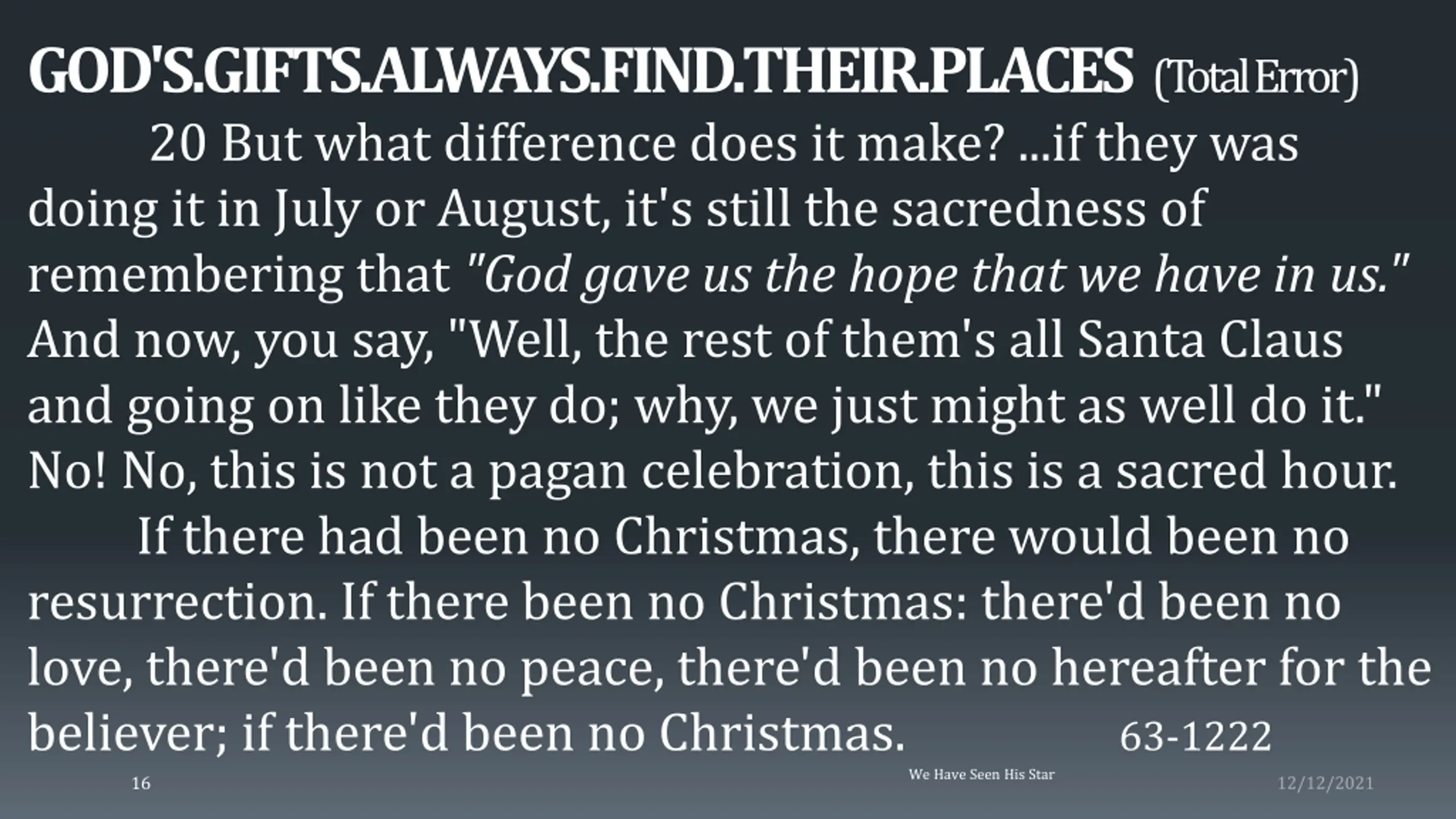 GOD'S.GIFTS.ALWAYS.FIND.THEIR.PLACES (Total Error) 20 But what difference does it make? ...if they was doing it in July or August, it's still the sacredness of remembering that "God gave us the hope that we have in us." And now, you say, "Well, the rest of them's all Santa Claus and going on like they do; why, we just might as well do it." No! No, this is not a pagan celebration, this is a sacred hour. If there had been no Christmas, there would been no resurrection. If there been no Christmas: there'd been no love, there'd been no peace, there'd been no hereafter for the believer; if there'd been no Christmas. 63-1222 We Have Seen His Star 16