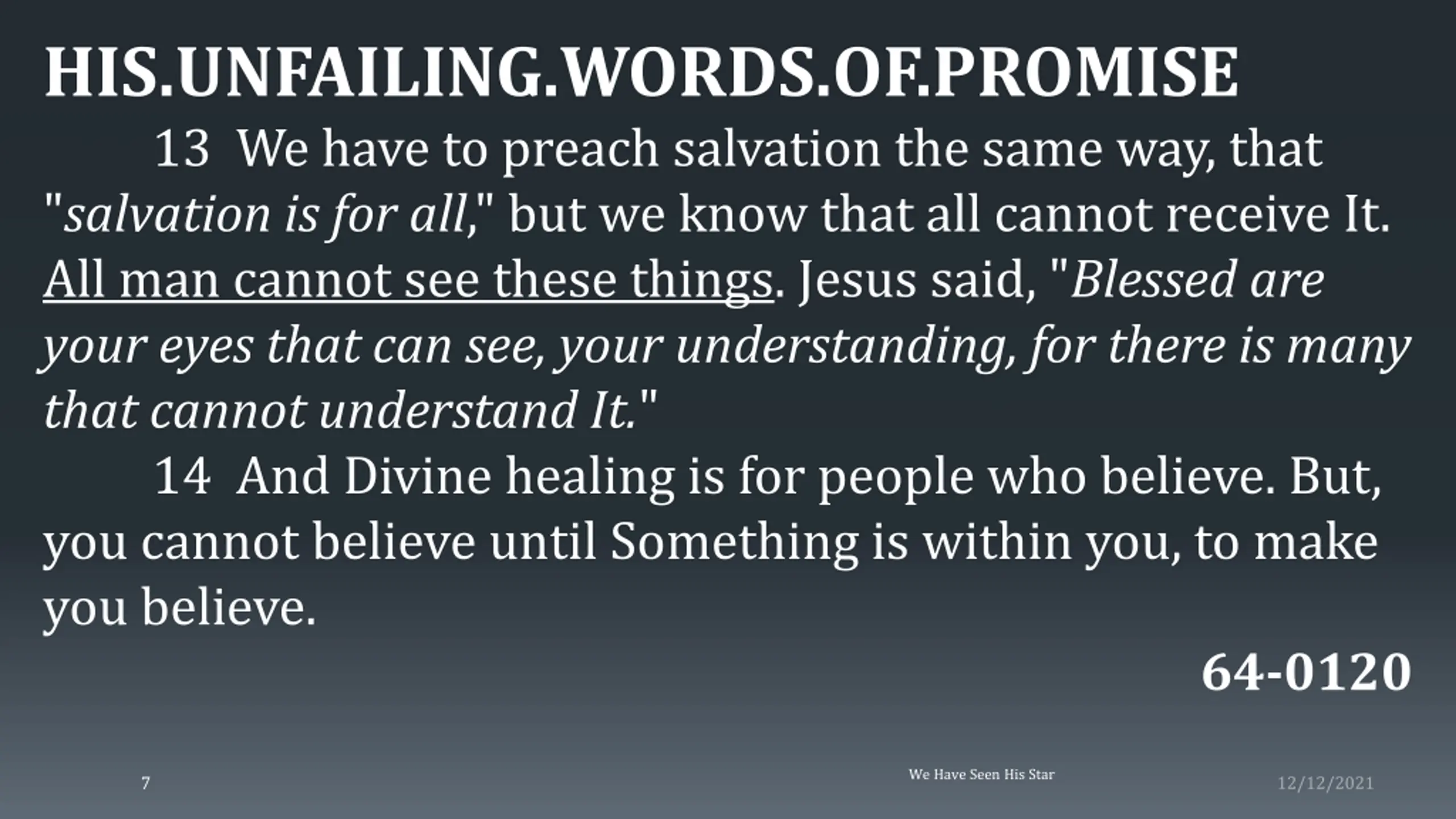 HIS.UNFAILING.WORDS.OF.PROMISE 13 We have to preach salvation the same way, that "salvation is for all," but we know that all cannot receive It. All man cannot see these things. Jesus said, "Blessed are your eyes that can see, your understanding, for there is many that cannot understand It." 14 And Divine healing is for people who believe. But, you cannot believe until Something is within you, to make you believe. 64-0120 We Have Seen His Star 7