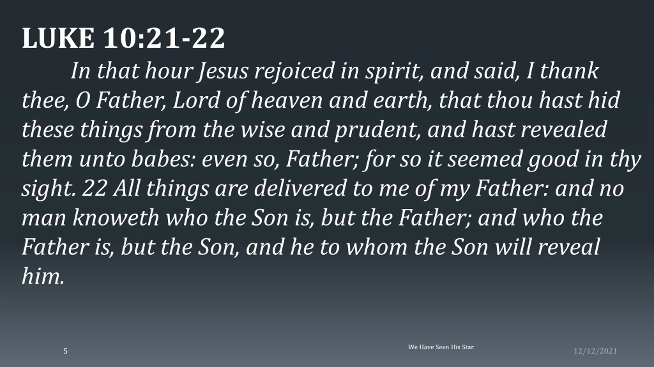 LUKE 10:21-22 In that hour Jesus rejoiced in spirit, and said, I thank thee, O Father, Lord of heaven and earth, that thou hast hid these things from the wise and prudent, and hast revealed them unto babes: even so, Father; for so it seemed good in thy sight. 22 All things are delivered to me of my Father: and no man knoweth who the Son is, but the Father; and who the Father is, but the Son, and he to whom the Son will reveal him. We Have Seen His Star 5