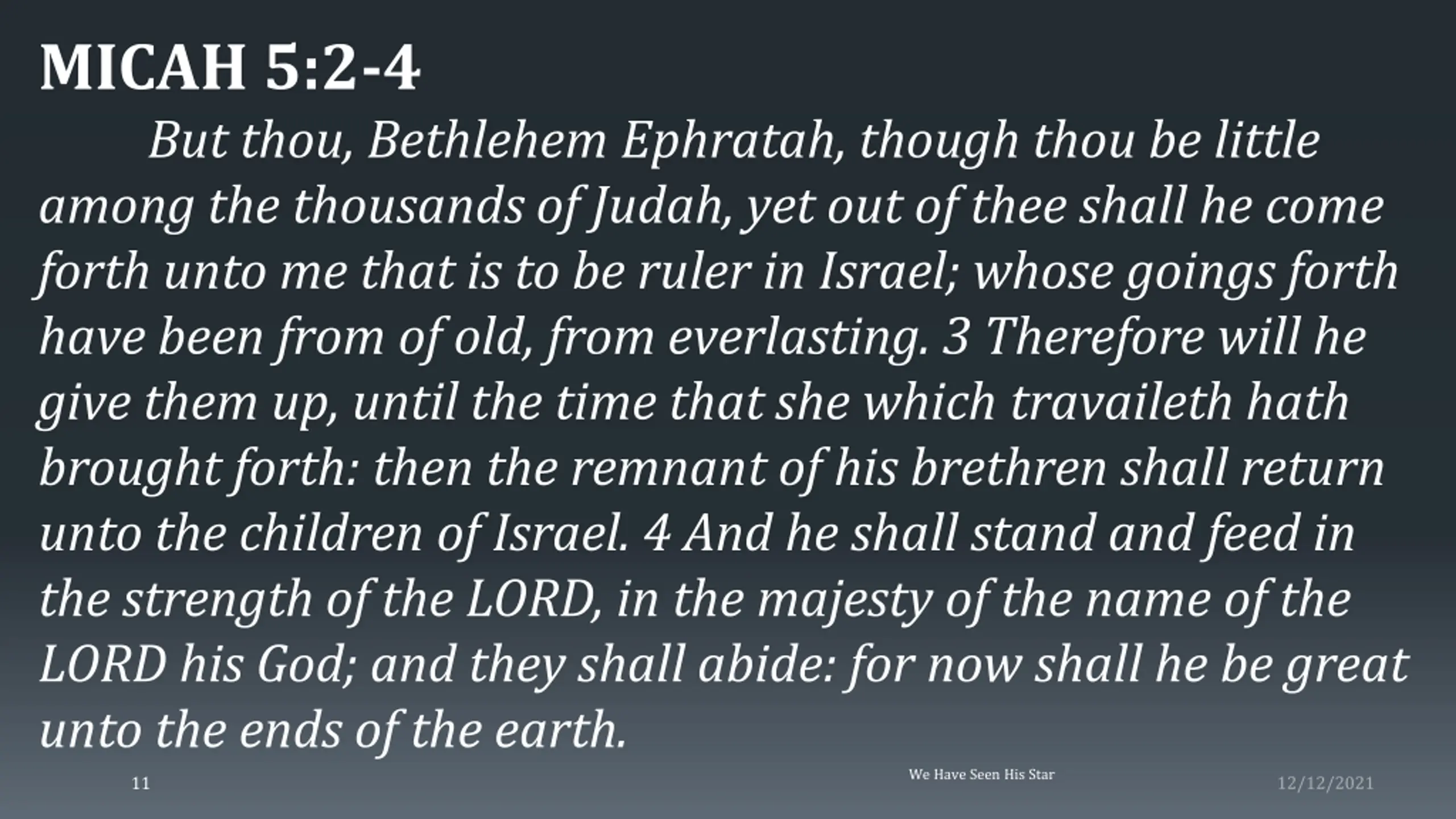 MICAH 5:2-4 But thou, Bethlehem Ephratah, though thou be little among the thousands of Judah, yet out of thee shall he come forth unto me that is to be ruler in Israel; whose goings forth have been from of old, from everlasting. 3 Therefore will he give them up, until the time that she which travaileth hath brought forth: then the remnant of his brethren shall return unto the children of Israel. 4 And he shall stand and feed in the strength of the LORD, in the majesty of the name of the LORD his God; and they shall abide: for now shall he be great unto the ends of the earth. We Have Seen His Star 11