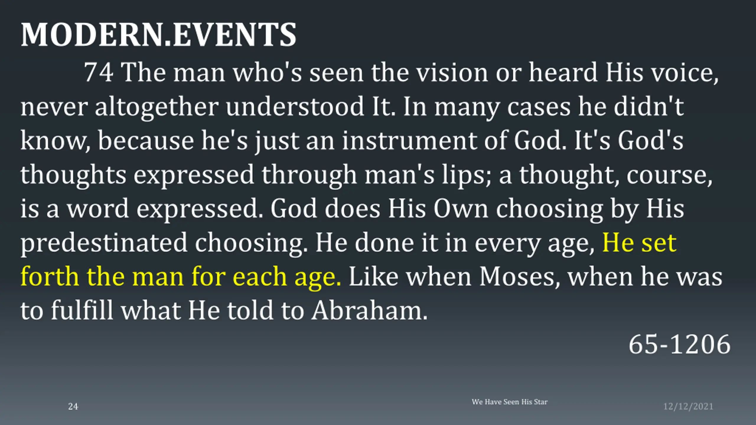 MODERN.EVENTS 74 The man who's seen the vision or heard His voice, never altogether understood It. In many cases he didn't know, because he's just an instrument of God. It's God's thoughts expressed through man's lips; a thought, course, is a word expressed. God does His Own choosing by His predestinated choosing. He done it in every age, He set forth the man for each age. Like when Moses, when he was to fulfill what He told to Abraham. 65-1206 We Have Seen His Star 24