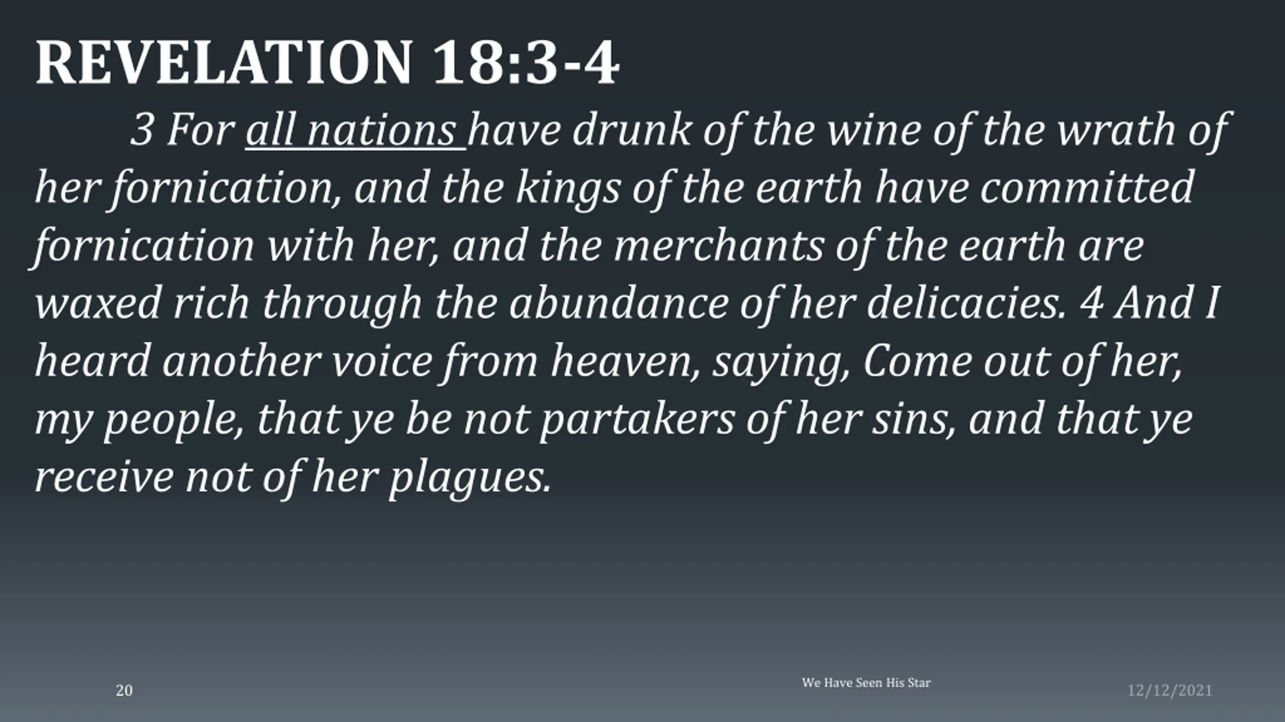 REVELATION 18:3-4 3 For all nations have drunk of the wine of the wrath of her fornication, and the kings of the earth have committed fornication with her, and the merchants of the earth are waxed rich through the abundance of her delicacies. 4 And I heard another voice from heaven, saying, Come out of her, my people, that ye be not partakers of her sins, and that ye receive not of her plagues. We Have Seen His Star 20