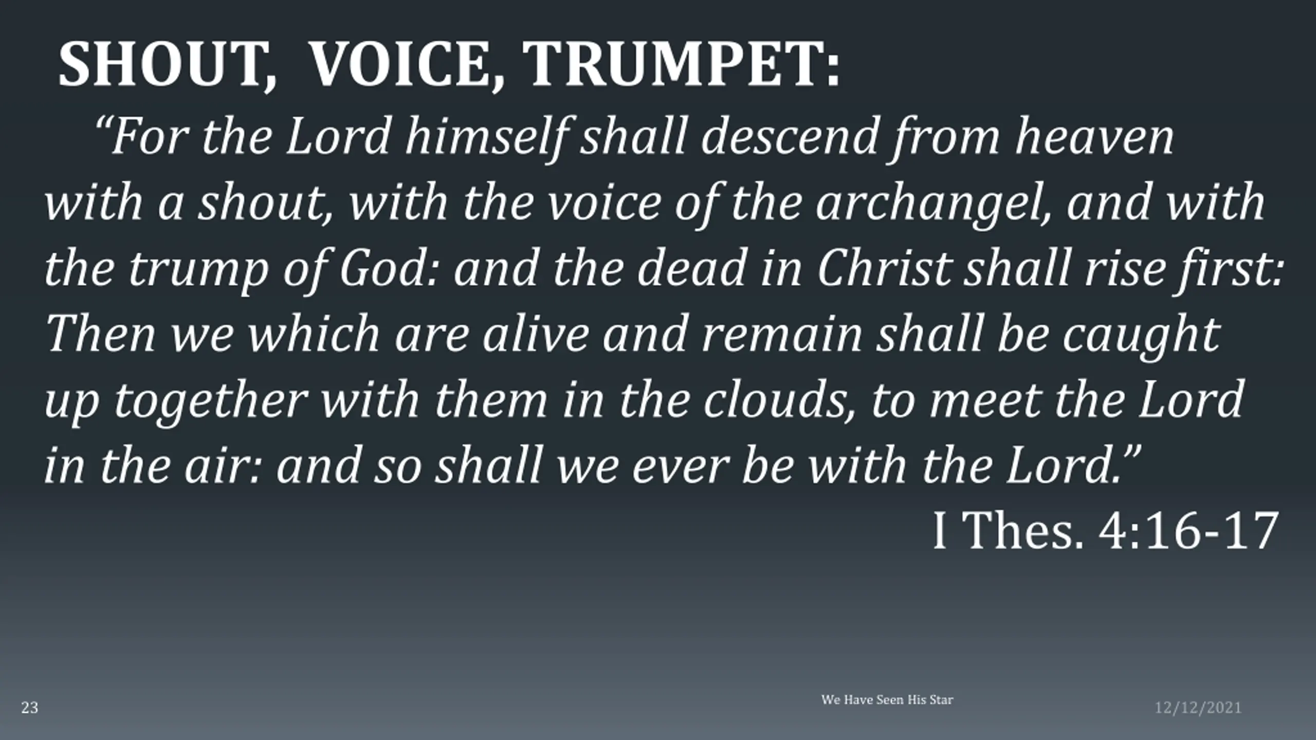 SHOUT, VOICE, TRUMPET: For the Lord himself shall descend from heaven with a shout, with the voice of the archangel, and with the trump of God: and the dead in Christ shall rise first: Then we which are alive and remain shall be caught up together with them in the clouds, to meet the Lord in the air: and so shall we ever be with the Lord. I Thes. 4:16-17 We Have Seen His Star 23