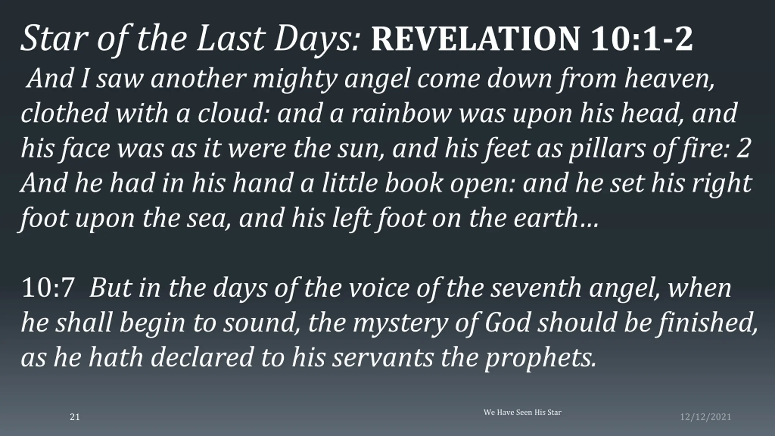 Star of the Last Days: REVELATION 10:1-2 And I saw another mighty angel come down from heaven, clothed with a cloud: and a rainbow was upon his head, and his face was as it were the sun, and his feet as pillars of fire: 2 And he had in his hand a little book open: and he set his right foot upon the sea, and his left foot on the earth 10:7 But in the days of the voice of the seventh angel, when he shall begin to sound, the mystery of God should be finished, as he hath declared to his servants the prophets. We Have Seen His Star 21