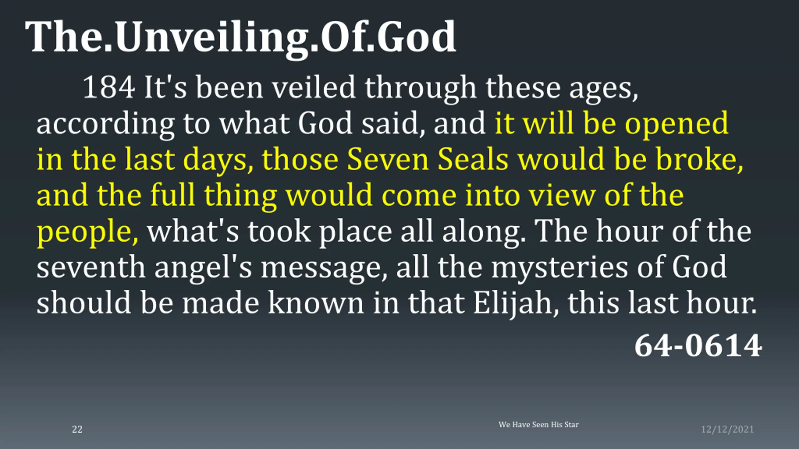 The.Unveiling.Of.God 184 It's been veiled through these ages, according to what God said, and it will be opened in the last days, those Seven Seals would be broke, and the full thing would come into view of the people, what's took place all along. The hour of the seventh angel's message, all the mysteries of God should be made known in that Elijah, this last hour. 64-0614 We Have Seen His Star 22
