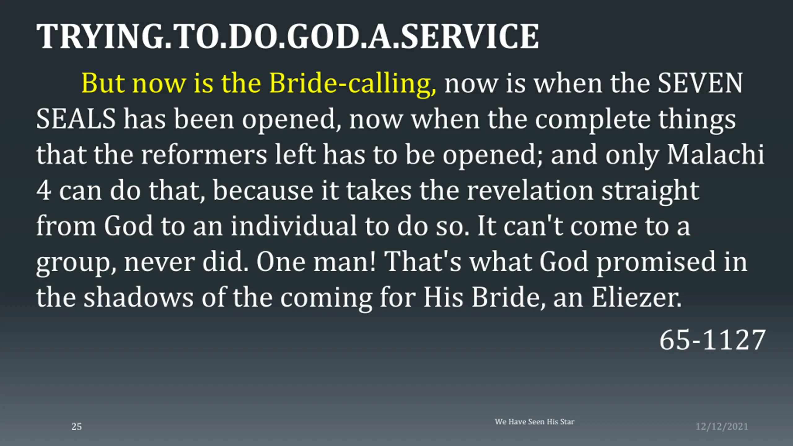 TRYING.TO.DO.GOD.A.SERVICE But now is the Bride-calling, now is when the SEVEN SEALS has been opened, now when the complete things that the reformers left has to be opened; and only Malachi 4 can do that, because it takes the revelation straight from God to an individual to do so. It can't come to a group, never did. One man! That's what God promised in the shadows of the coming for His Bride, an Eliezer. 65-1127 We Have Seen His Star 25