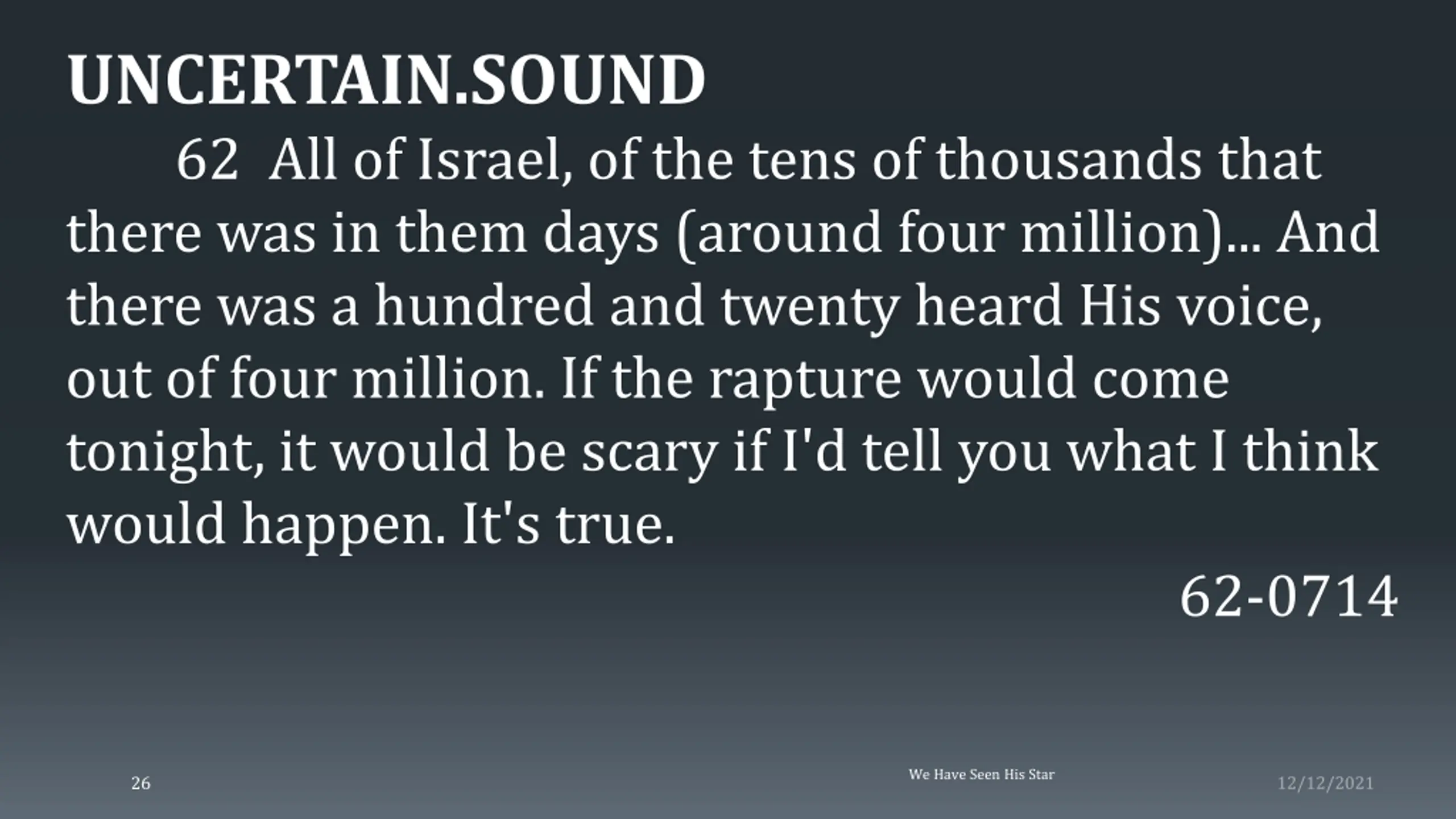 UNCERTAIN.SOUND 62 All of Israel, of the tens of thousands that there was in them days (around four million)... And there was a hundred and twenty heard His voice, out of four million. If the rapture would come tonight, it would be scary if I'd tell you what I think would happen. It's true. 62-0714 We Have Seen His Star 26