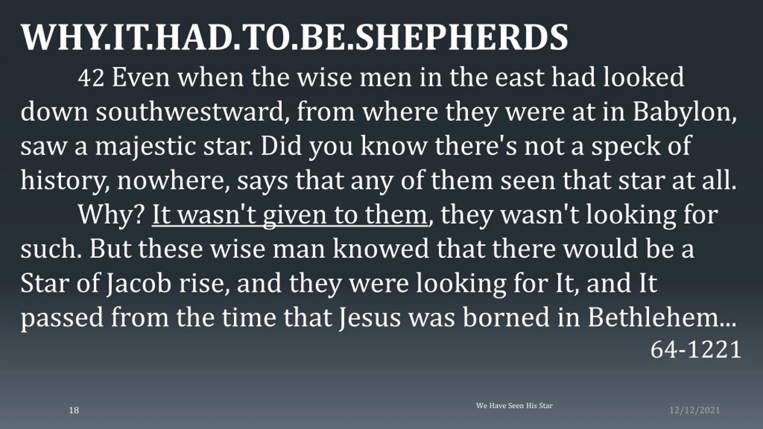 WHY.IT.HAD.TO.BE.SHEPHERDS 42 Even when the wise men in the east had looked down southwestward, from where they were at in Babylon, saw a majestic star. Did you know there's not a speck of history, nowhere, says that any of them seen that star at all. Why? It wasn't given to them, they wasn't looking for such. But these wise man knowed that there would be a Star of Jacob rise, and they were looking for It, and It passed from the time that Jesus was borned in Bethlehem... 64-1221 We Have Seen His Star 18