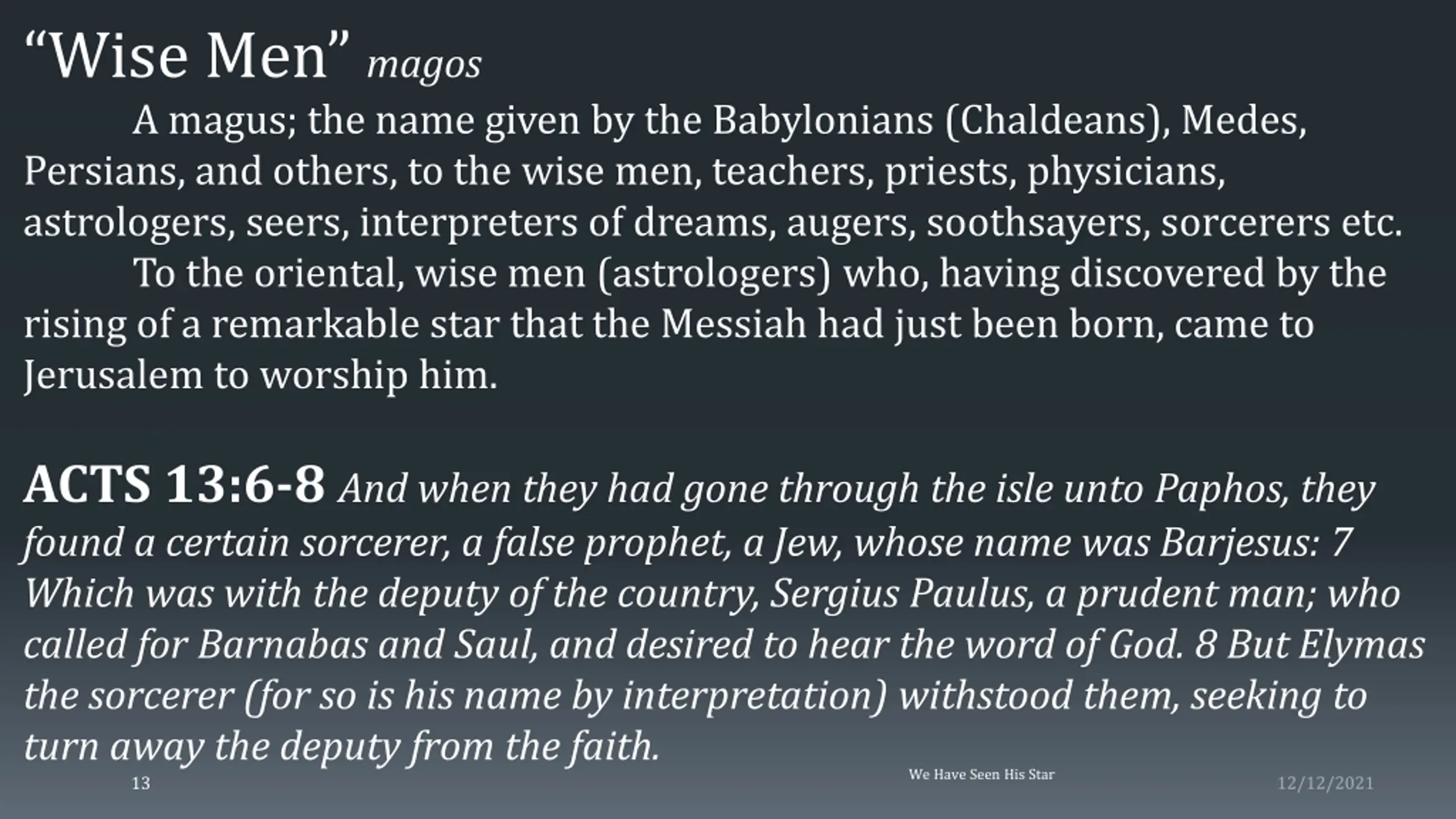 Wise Men magos A magus; the name given by the Babylonians (Chaldeans), Medes, Persians, and others, to the wise men, teachers, priests, physicians, astrologers, seers, interpreters of dreams, augers, soothsayers, sorcerers etc. To the oriental, wise men (astrologers) who, having discovered by the rising of a remarkable star that the Messiah had just been born, came to Jerusalem to worship him. ACTS 13:6-8 And when they had gone through the isle unto Paphos, they found a certain sorcerer, a false prophet, a Jew, whose name was Barjesus: 7 Which was with the deputy of the country, Sergius Paulus, a prudent man; who called for Barnabas and Saul, and desired to hear the word of God. 8 But Elymas the sorcerer (for so is his name by interpretation) withstood them, seeking to turn away the deputy from the faith. We Have Seen His Star 13