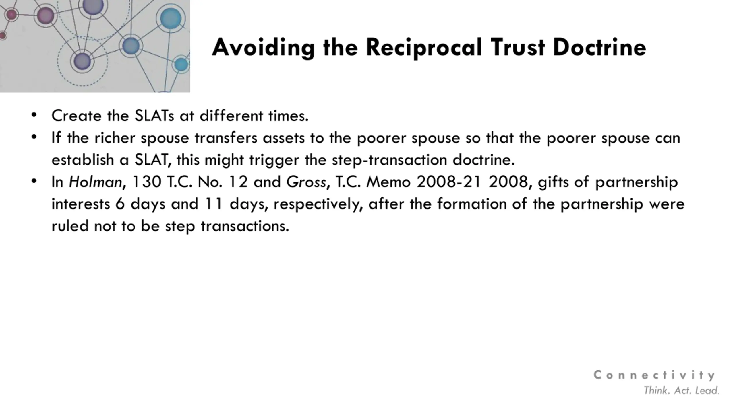 Avoiding the Reciprocal Trust Doctrine Create the SLATs at different times. If the richer spouse transfers assets to the poorer spouse so that the poorer spouse can establish a SLAT, this might trigger the step-transaction doctrine. In Holman, 130 T.C. No. 12 and Gross, T.C. Memo 2008-21 2008, gifts of partnership interests 6 days and 11 days, respectively, after the formation of the partnership were ruled not to be step transactions. C o n n e c t i v i t y Think. Act. Lead.